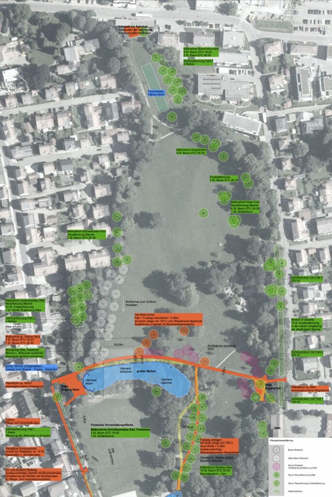 Der Gemeinderat hat am 13. September 2023 in öffentlicher Sitzung das Gesamtkonzept für den Schlosspark gebilligt und die Verwaltung beauftragt, die Maßnahmen für das Handlungsfeld 1 (Grünräume und Vegetation) öffentlich auszuschreiben. Mit der Umsetzung wird voraussichtlich am 20. November 2023 begonnen. Zuerst werden bereits abgestorbene Bäume oder Bäume mit schlechter Vitalität und geringer Lebenserwartung gefällt bzw. zurückgeschnitten. Hauptsächlich betrifft dies Eschen, welche vom Eschentriebsterben befallen sind. Anschließend werden 58 neue Bäume gepflanzt. Diese „Klimabäume“ sollen die ausgefallenen Bäume ersetzen und den Bestand im Schlosspark widerstandsfähiger gegenüber den zu erwartenden Klimaveränderungen machen. Weitere 22 Bäume folgen im kommenden Herbst. Parallel zu den Baumpflanzungen wird eine Vielzahl neuer Sträucher eingebracht, welche vor allem die Parkaußenränder ausformen und ergänzen sollen.