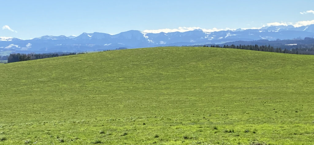 Vorfrühlingsstimmung, eingefangen von Julian Aicher am 25. Februar zwischen Zaisenhofen und Goppertshofen. Der Hügel, ein sogenannter Drumlin, zeigt sich schon in lebensfrohem Grün, während die blauen Bergen noch da und dort schneebedeckt sind.