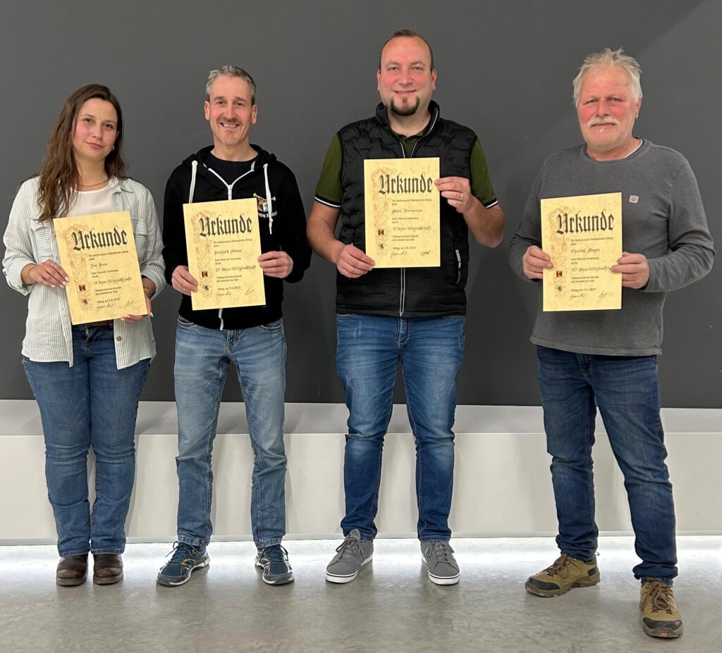 Geehrte: Iris Kunz 10 Jahre, Reinhold Maier 35 Jahre, Marc Russmann 10 Jahre, Christof Mayer 45 Jahre. Es fehlen auf dem Bild Florian Gernert 5 Jahre und Hubert Graf 45 Jahre.