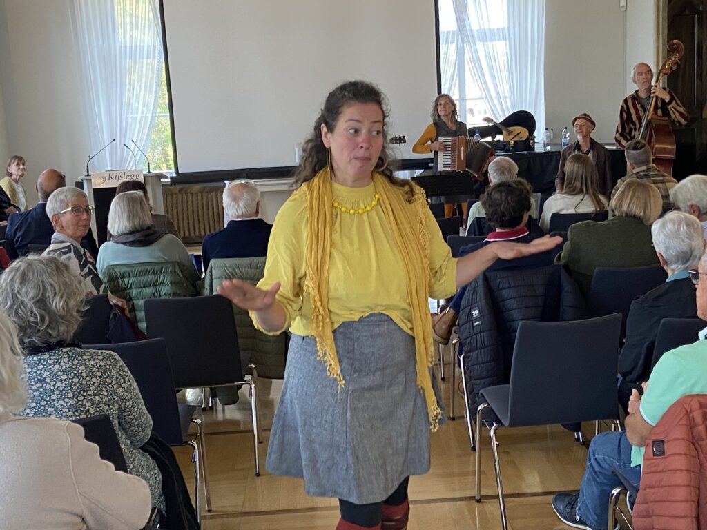 „Yesterday“. Gitarrist Thomas Linder eröffnete am Sonntagnachmittag den Reigen. Dann sang seine Kollegin Moni Bothe (Bild) „Weine nicht, wenn der Regen fällt“. Derweil hätten in Kißlegg 2024 so manche mehr als einen Grund dazu gehabt. Für Bürgermeister Dieter Krattenmacher deshalb auch das markanteste Kleidungsstück Kißlegg 2024: der Gummistiefel. Dieses Beinkleid so aktuell, dass es noch nicht als Ausstellungsstück auffiel.