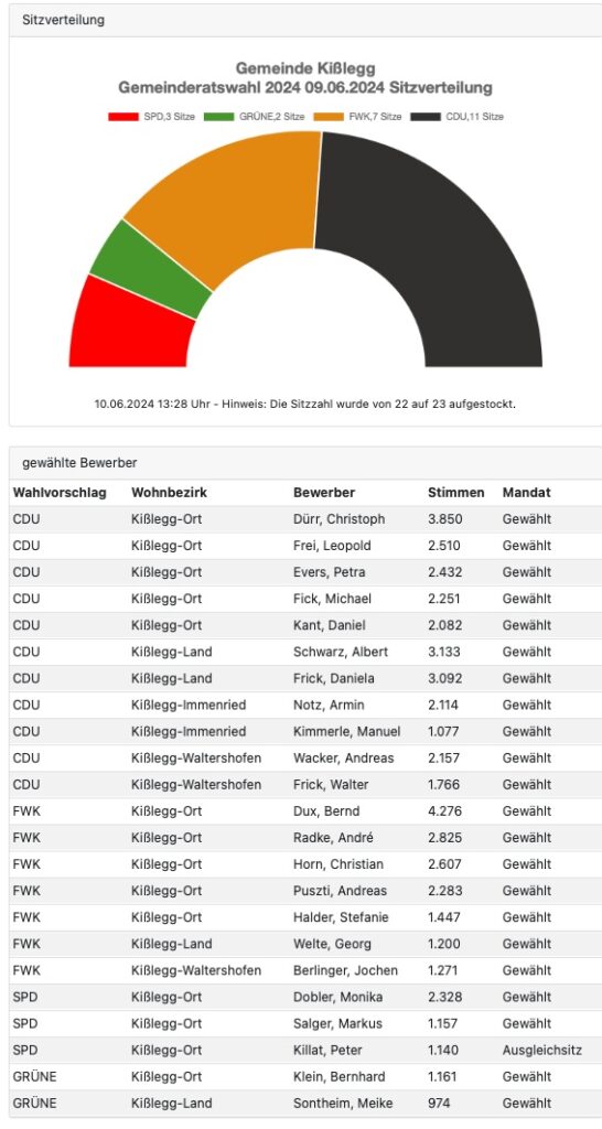 Kißlegg (rei) – Bei der Gemeinderatswahl in Kißlegg siegte die CDU mit 46,6 Prozent der Stimmen. Auf die Freien Wähler entfielen 30,6 Prozent, auf die SPD 13,3 und auf die Grünen 9,5 Prozent. Die 23 Sitze verteilen sich wie folgt: CDU 11 Sitze, FWK 7 Sitze, SPD 3 und Grüne 2 Sitze. Nachstehend die Liste der Gewählten, der Webseite der Gemeinde Kißlegg entnommen (dort eingestellt um 13.28 Uhr):