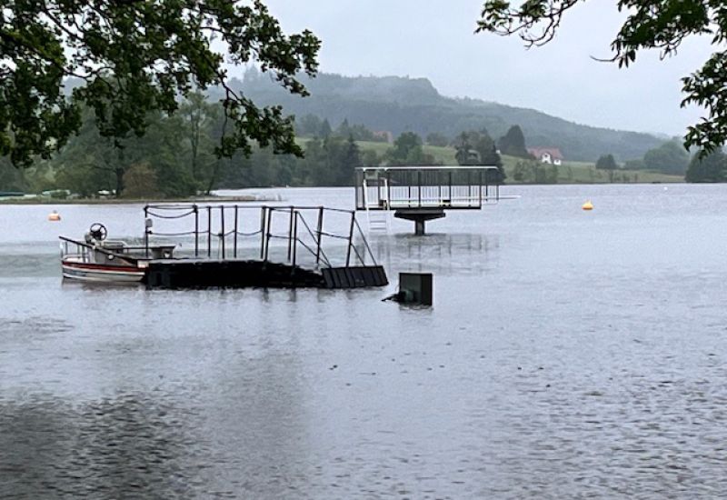 Kißlegg – „Ein sehr anstrengender Tag des Hochwassers in Kißlegg neigt sich dem Ende zu“, schreibt uns um 20.50 Uhr Kißleggs Bürgermeister Dieter Krattenmacher und schickt etliche Bilder vom Hochwasser in seiner Gemeinde. „Feuerwehr, Bauhof, Gemeindehausmeister und Johanniter waren/sind pausenlos im Einsatz, um die Auswirkungen des Hochwassers möglichst im Schach zu halten.“ Der Wasserspiegel des Obersees ist um rund 2 Meter angestiegen. Aus dem 3-Meter-Sprungturm wurde einer mit einem Meter. N…