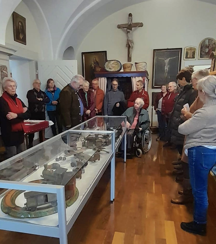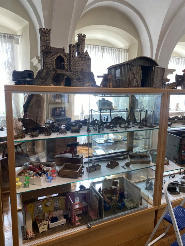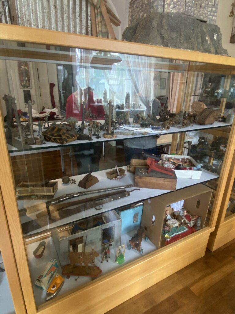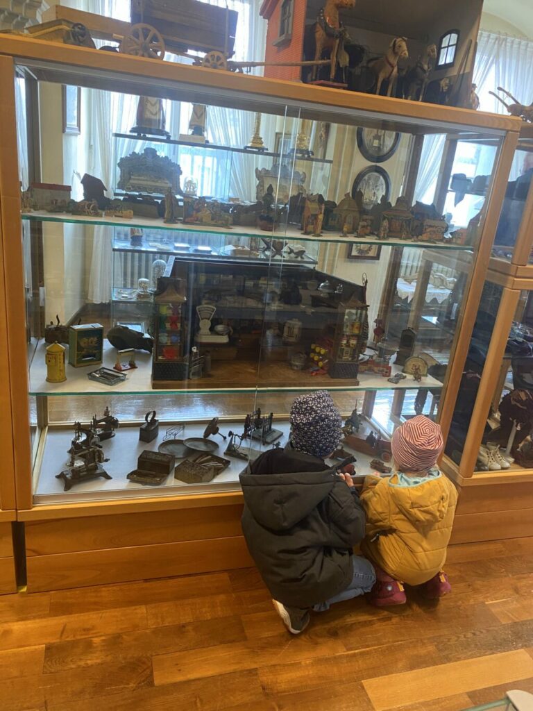 Aber es ist auch jede Menge Spielzeug für Mädchen vorhanden. Hier sticht natürlich zuerst der mächtige Kaufladen ins Auge. Handwerklich mit viel Geschick und Aufwand gefertigt, ausgestatten wie ein Tante-Emma-Laden aus früheren Zeiten. Außerdem finden wir Puppenstuben aus verschiedenen Epochen bis in die 70er-Jahre, eine davon hat sogar ihr Zuhause in einem Bananenkarton gefunden. So könnte man hier noch Vieles erwähnen, wie zum Beispiel das alte Blechauto mit Holzvergaser oder die drei schönen alten Kindernähmaschinen. Die Führung des Heimatpflegers durch diese Ausstellung ließ erahnen, wie viel Freude und Begeisterung für das alte Spielzeug hier vorhanden ist.