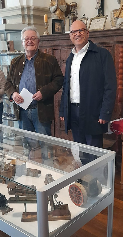 Nach einem weiteren Musikstück des Alphornbläsertrios ging die Moderation über an Heimatpfleger Bernd Mauch (Bild; mit Bürgermeister Krattenmacher), der mit Sachverstand und breitem Hintergrundwissen die anwesenden Besucher zu den einzelnen Vitrinen führte und zu jedem Gegenstand etwas zu sagen wusste. Da hörten die Besucher Herstellernamen der Eisenbahn, wie Karl Bub und Kraus-Fandor aus Nürnberg, Blechflugzeuge von der Firma Tippco aus Nürnberg; ein schöner alter Traktor mit der Aufschrift GAMA war von der Firma Georg Adam Mangold aus Fürth hergestellt und Bernd Mauch wusste zu berichten, dass diese Firma, als eine der ersten nach dem Zweiten Weltkrieg, von den Alliierten wieder eine Lizenz zur Spielzeugfertigung bekam. In weiteren Vitrinen gab es viel interessante Details zu erfahren. Ein Stollwerck-Schokoladen-Sparautomat aus den 1930er-Jahren, hergestellt von der Firma Hartwig und Vogel aus Dresden ist ebenso eine Rarität wie die in einer anderen Vitrine gezeigten Soldaten aus Elastolin, die von der Firma Hausser aus Ludwigsburg in großer Detailtreue gefertigt wurden.