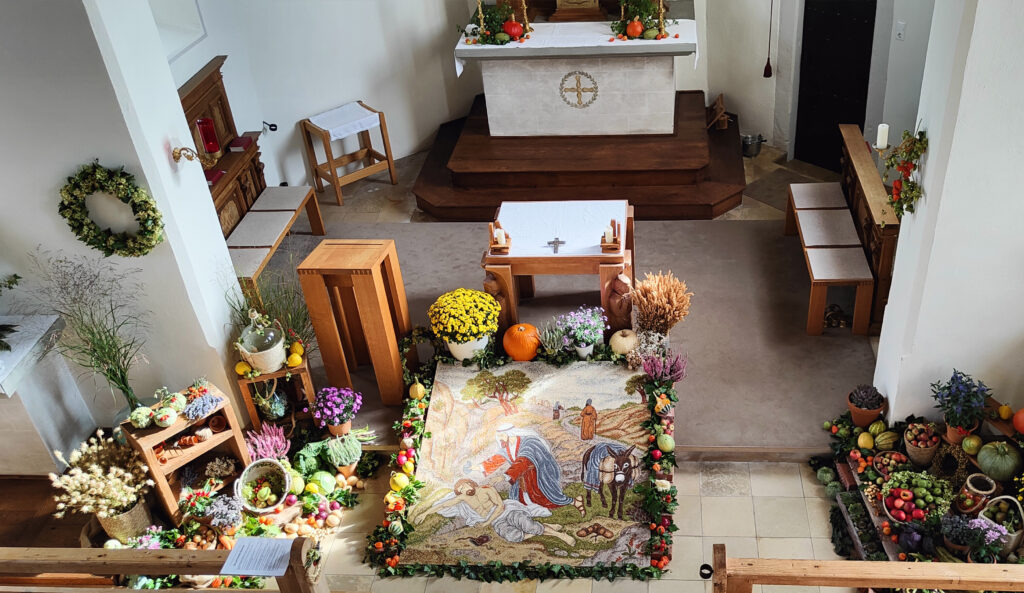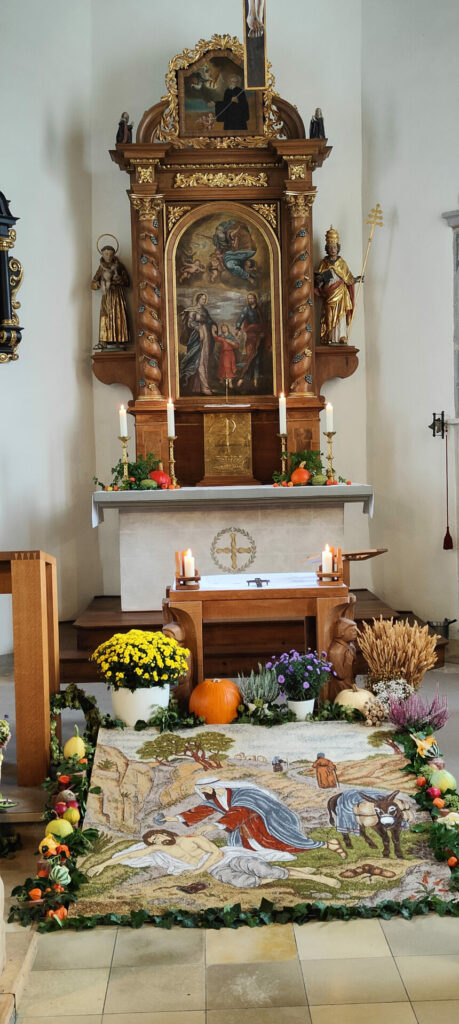 Die weiteren Erntedankgaben um das Bild herum wie Kürbisse, Gemüse, verschiedene Obstsorten, Getreide und Brot gestaltet Kimmerle dann zusammen mit ihrer Nachbarin Maria Gröber, so dass vom Eingang in die Kapelle bis zum Altar alles rundum mit Früchten der Erde zum Erntedankfest abgestimmt ist.