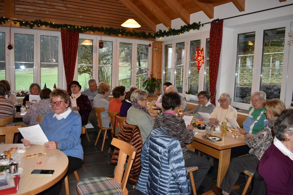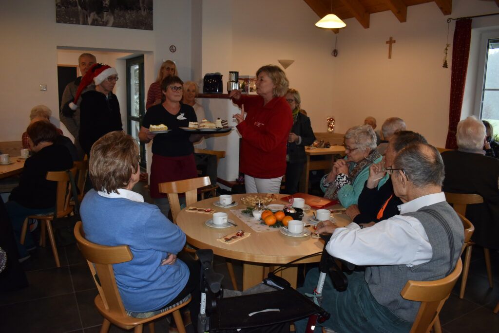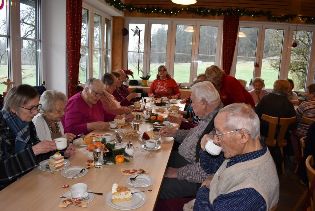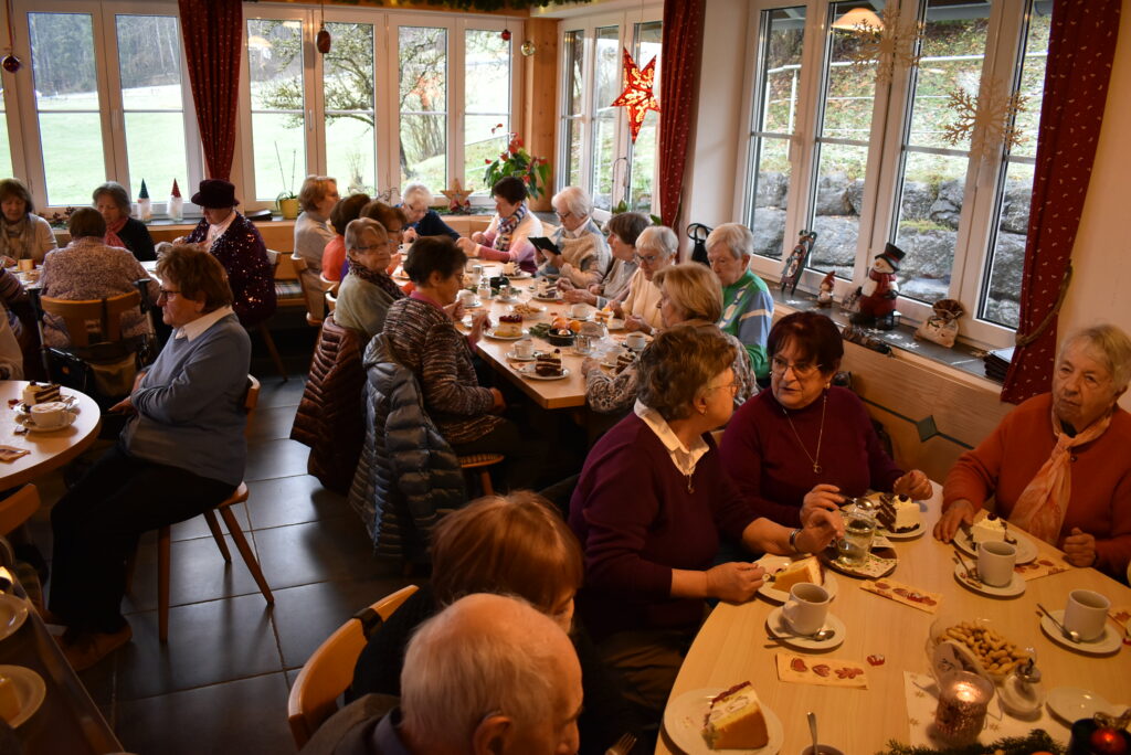 Es schneite leicht und drinnen warteten adventlich dekorierte Tische auf die rund 50 froh gelaunten Gäste des DRK Wangen-Leutkirch. Das Tortenbüffet der netten Wirtsleute war reichlich gedeckt, sogleich wurden die wunderbarsten Kuchen kredenzt und alle freuten sich auf warmen Kaffee oder Tee.