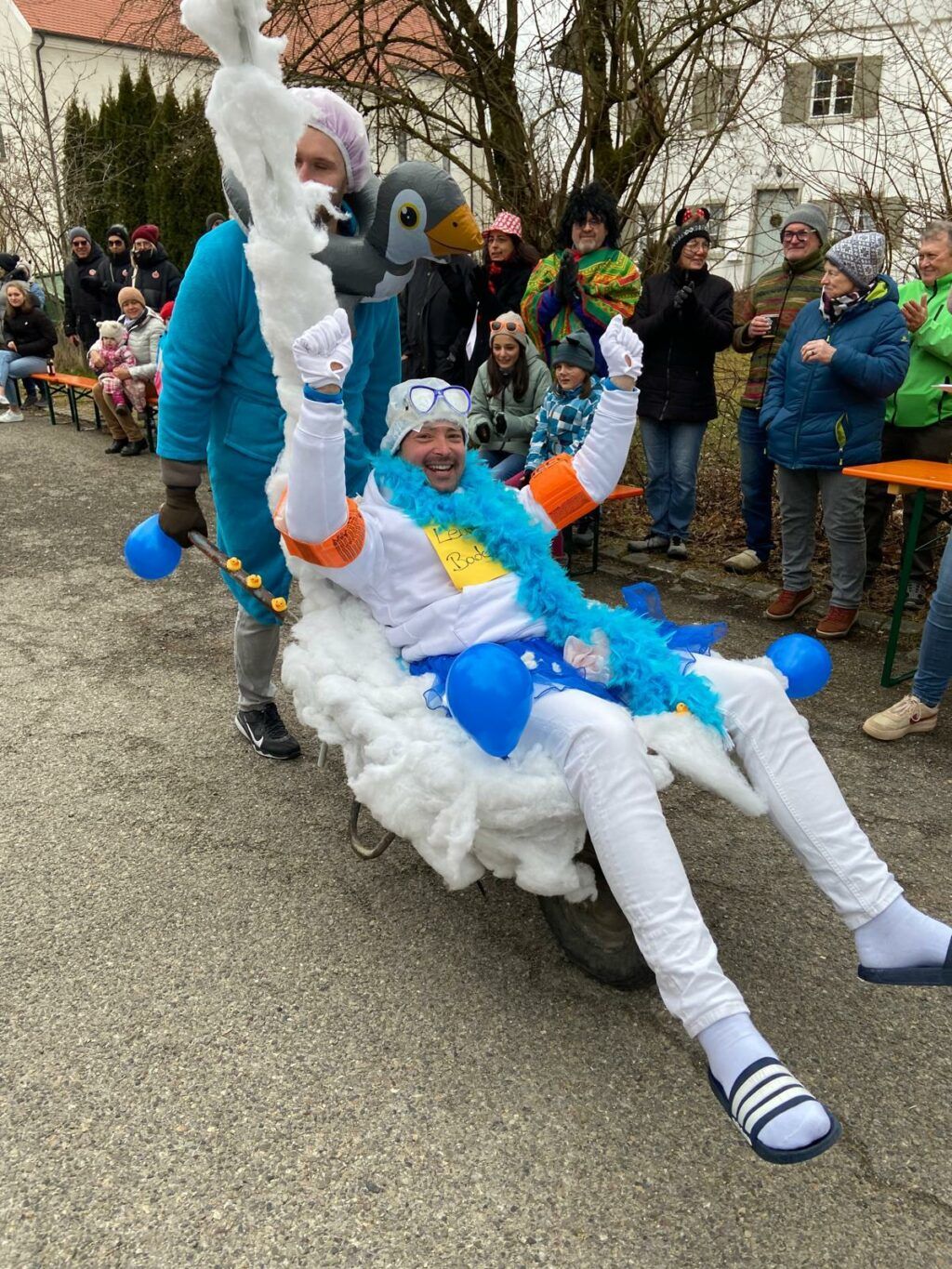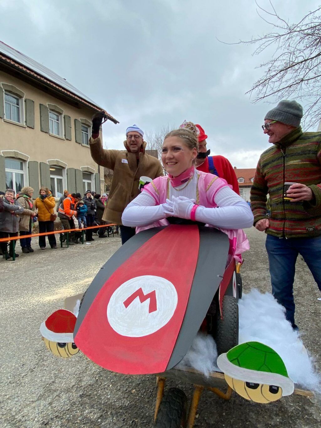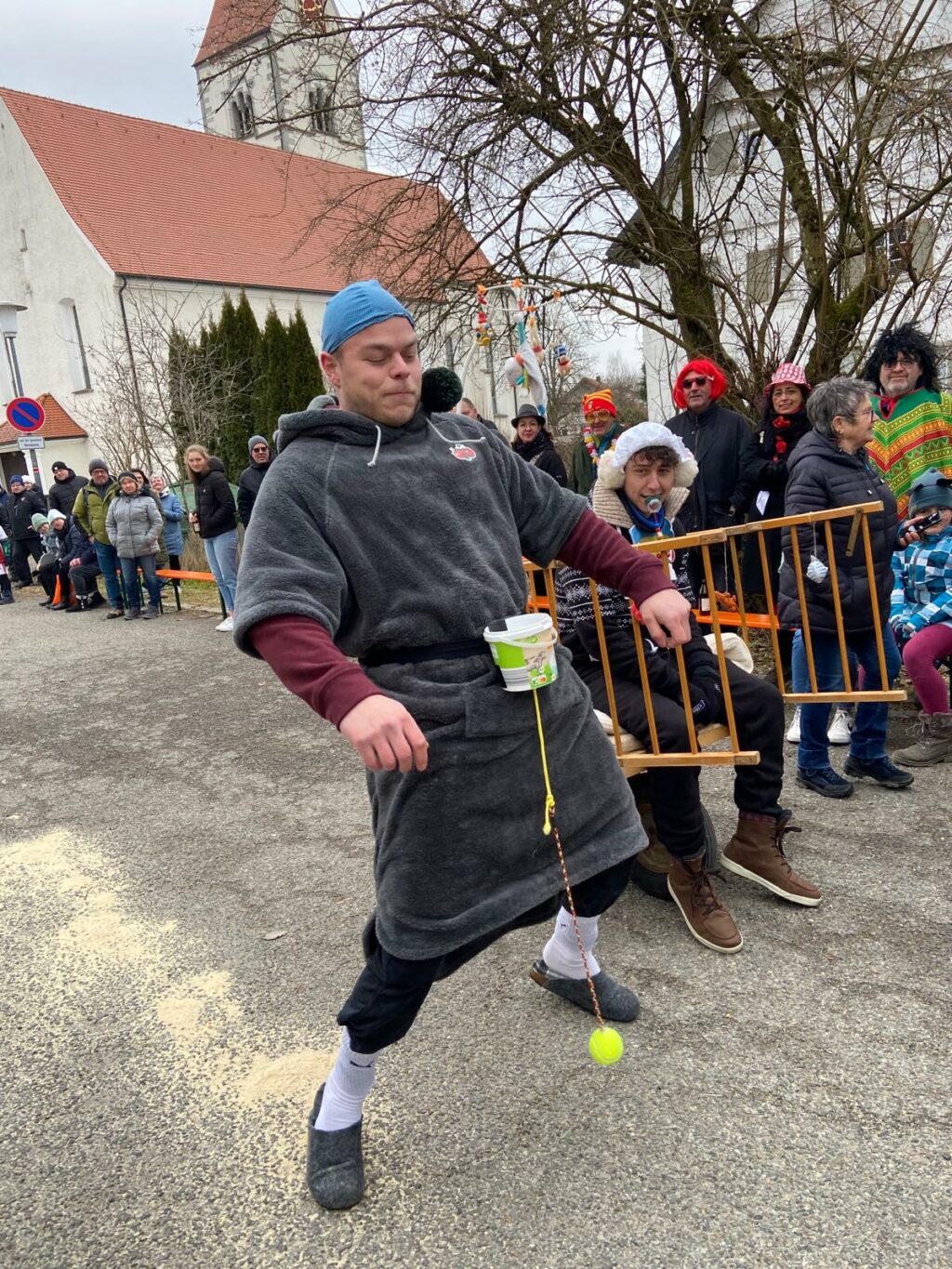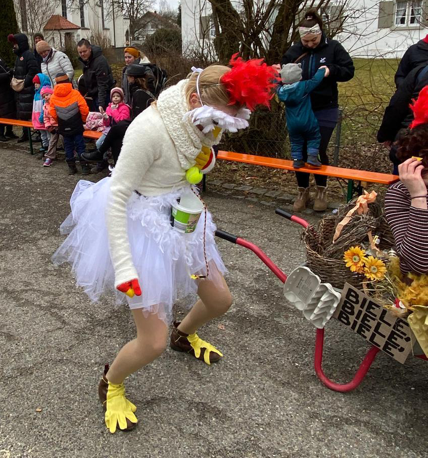 Urlau – „Schieb“, so lautete das Fasnets-Motto am Samstagnachmittag, 1. März, ab 13.30 Uhr in Urlau zwischen Kirche und Genussmanufaktur. Dabei setzten sich 15 Gefährte in Bewegung. Da war „Hüftschwung“ gefragt. Denn die Fahrerinnen und Fahrer mussten an einem Streckenabschnitt Halt machen; dort bekamen sie um den Gürtelpunkt einen kleinen Becher gebunden – samt Schnur und einem Tennisball dran. Diesen Ball galt es dann mit Hüftschwung in den Becher zu bugsieren. Kurz: „Das Runde musste ins Runde.“ Das sorgte für Bewegung – und für Erheiterung der Narretei-Begeisterten entlang der Straße. Unser Reporter Julian Aicher hat das Urlauer „Schubkarra-Schieba“ mit obligatorischem Hüftschwung fotografiert. Nachstehend die Bilder.