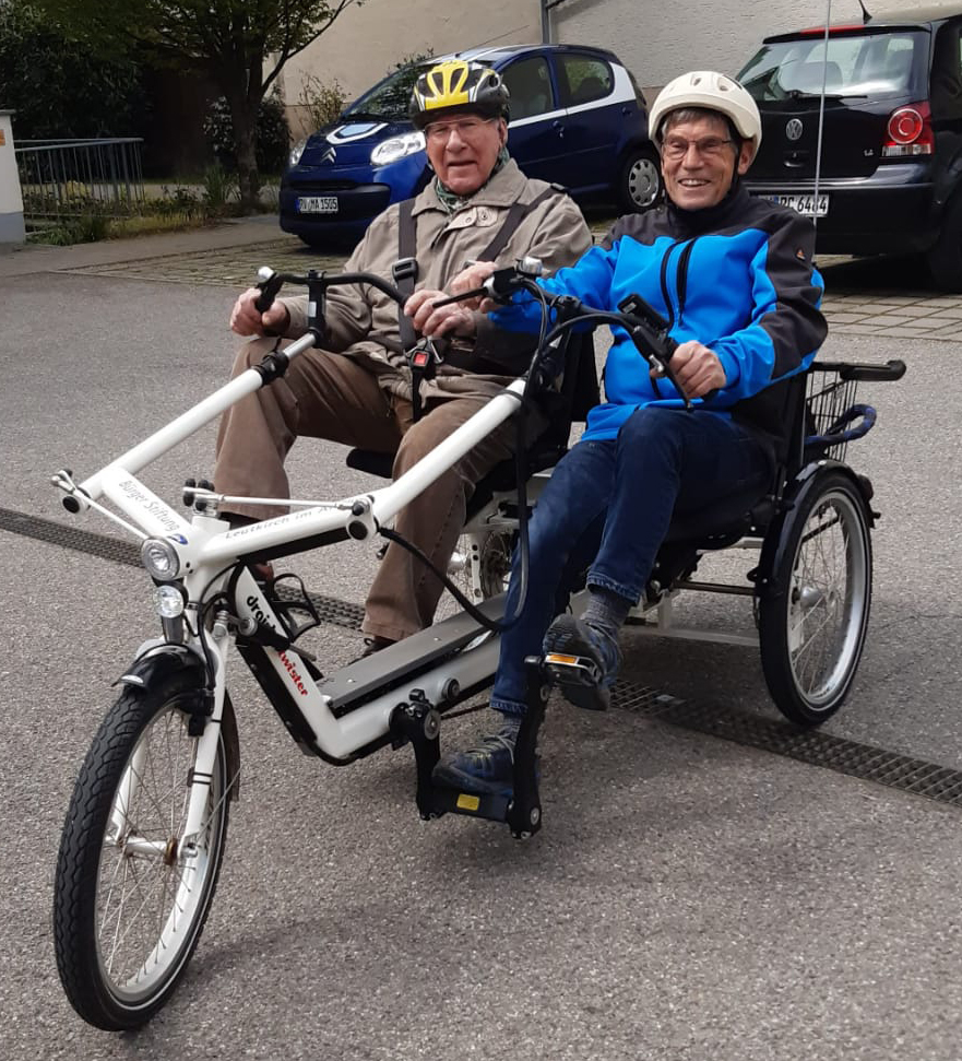 Gedacht ist das E-Trike zur Mitnahme einer Person mit Handicap oder älterer Menschen, die alleine nicht mehr mit dem Rad fahren können. Die Pedale des „Passagiers“ haben Haltebänder für die Füße. Dabei können die Pedale wahlweise an die des Fahrers gekoppelt werden, so dass eine ständige Bewegung der Beine des Mitfahrers stattfindet. Alternativ kann auf Freilauf geschaltet werden. Der Fahrer kann dann alleine seine Leistung (mit E-Unterstützung) zum Vortrieb auf die Pedale bringen. Parallel dazu kann der Mitfahrer durch aktives Treten nach seinen Möglichkeiten mit beitragen. Die Sitze sind mehrfach verstellbar. Für den „Passagier“ sind Sicherheitsgurte vorhanden. Während der Fahrt sind Fahrradhelme zu tragen. Diese sind selbst mitzubringen. Die Fahrten erfolgen auf erfolgen auf eigenes Risiko.