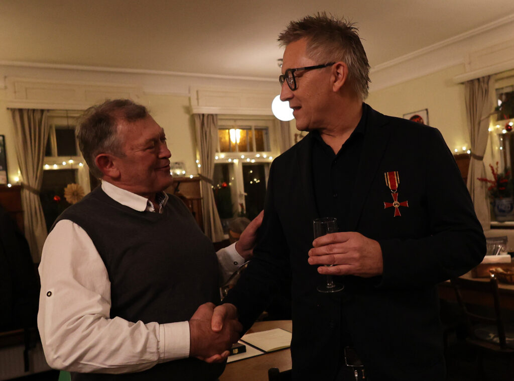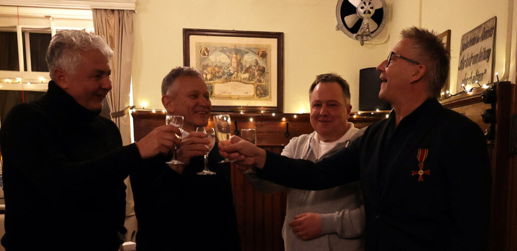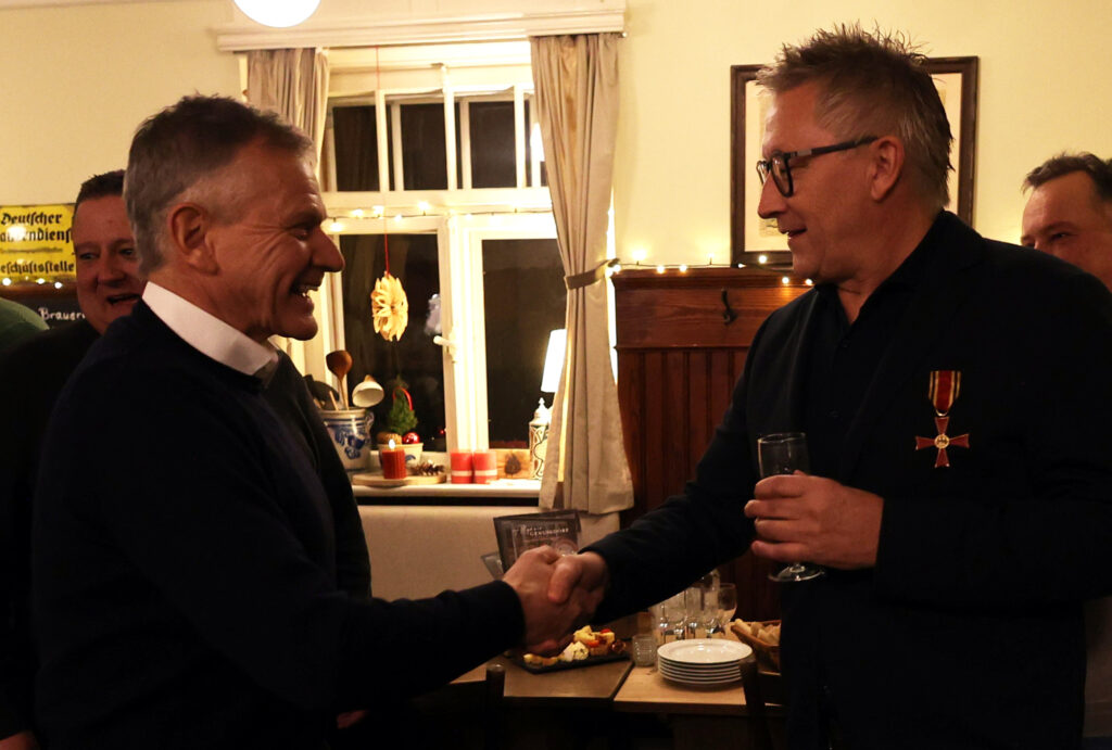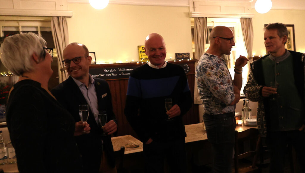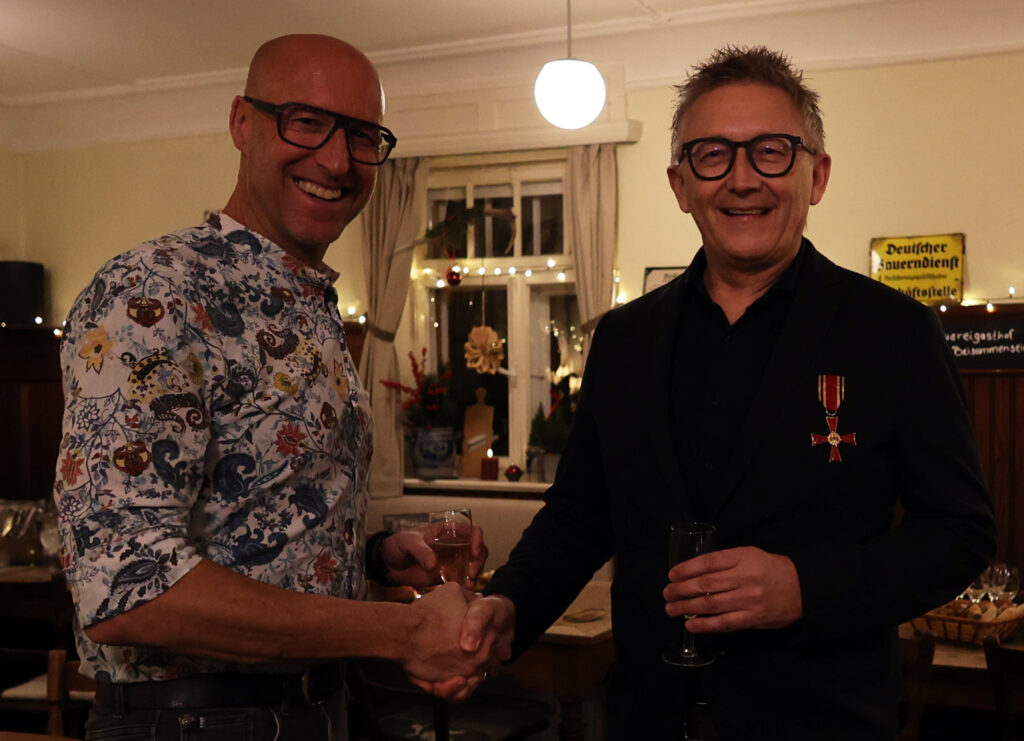 Der Gastgeber ließ sich nicht lumpen und tischte nach Sekt und Käseplatte Rinderbraten mit Spätzle und Pommes frites auf, abgerundet mit einem Dessert. Statt steifer Reden gab es freundschaftlichen Austausch und launige Worte des Laureaten. In gemütlicher Runde ließ Skrodzki viele Projekte Revue passieren; dabei hatte er stets seine aktiven Begleiter im Blick: „Bundesverdienstkreuzträger wird man nicht im Alleingang!“ Dieser Ausspruch von Winfried Kretschmann träfe punktgenau auf ihn selbst zu. Den Ministerpräsidenten habe er als empathischen Menschen empfunden, der nach dem offiziellen Akt der Verleihung auf die Ausgezeichneten zugegangen sei (neben Christian Skrodzki wurde das Bundesverdienstkreuz noch an 16 weitere Bürger verliehen).