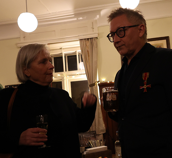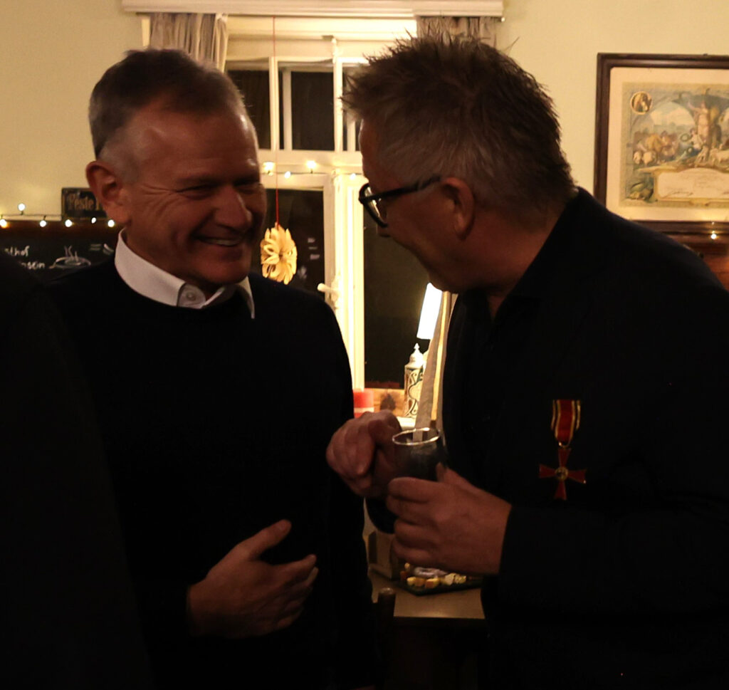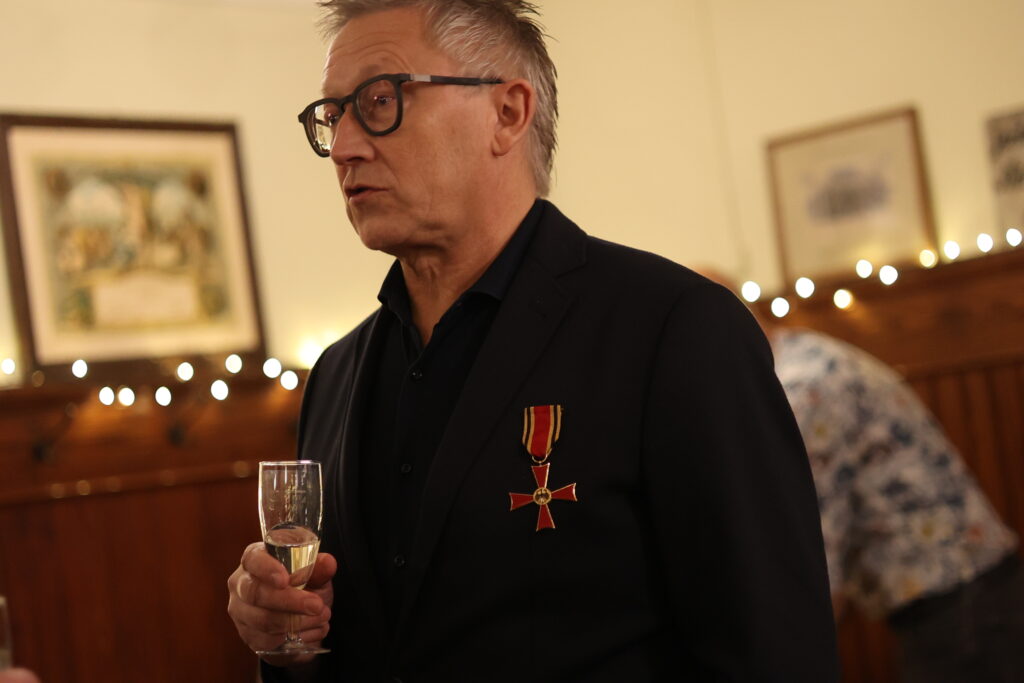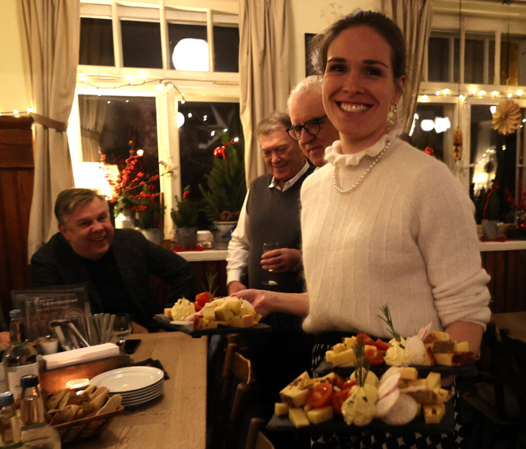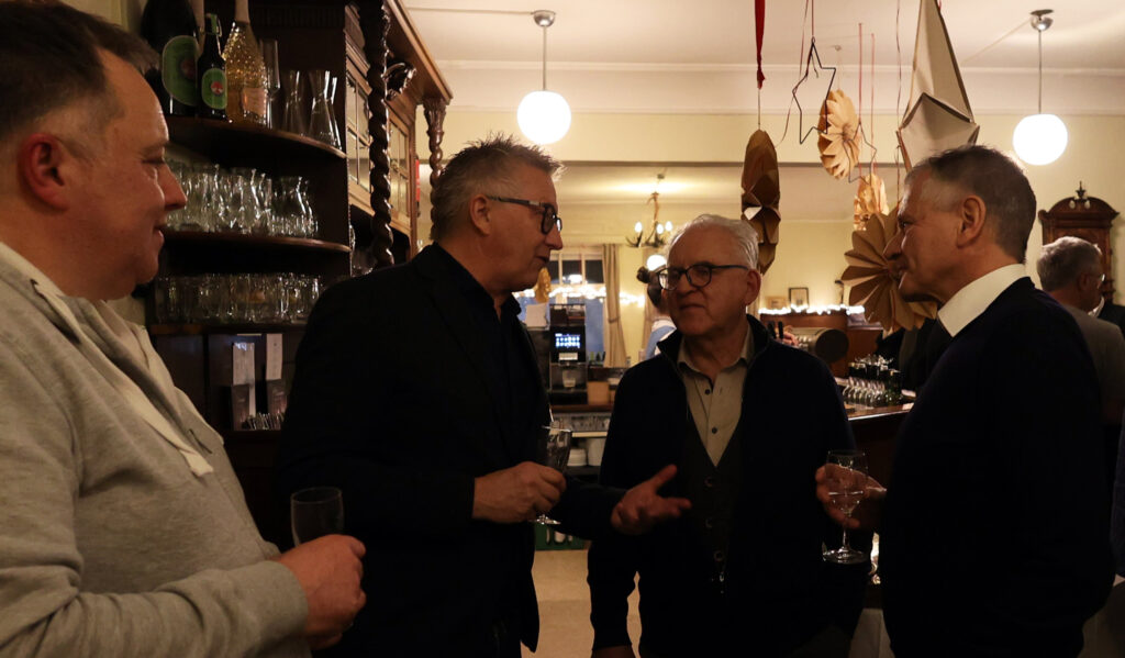 Der Gastgeber ließ sich nicht lumpen und tischte nach Sekt und Käseplatte Rinderbraten mit Spätzle und Pommes frites auf, abgerundet mit einem Dessert. Statt steifer Reden gab es freundschaftlichen Austausch und launige Worte des Laureaten. In gemütlicher Runde ließ Skrodzki viele Projekte Revue passieren; dabei hatte er stets seine aktiven Begleiter im Blick: „Bundesverdienstkreuzträger wird man nicht im Alleingang!“ Dieser Ausspruch von Winfried Kretschmann träfe punktgenau auf ihn selbst zu. Den Ministerpräsidenten habe er als empathischen Menschen empfunden, der nach dem offiziellen Akt der Verleihung auf die Ausgezeichneten zugegangen sei (neben Christian Skrodzki wurde das Bundesverdienstkreuz noch an 16 weitere Bürger verliehen).