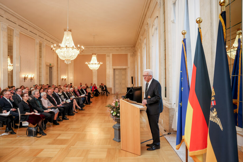 „Ehrenamt ist gelebter Bürgergeist. Der Zusammenhalt in unserer Gesellschaft hängt ganz entscheidend von Menschen ab, die sich für das Wohl der Allgemeinheit einsetzen. Ich bin immer wieder tief beeindruckt, was Menschen selbstlos für andere leisten“, sagte Ministerpräsident Winfried Kretschmann bei der Überreichung am Freitag, 6. Dezember, im Neuen Schloss in Stuttgart. „Ich möchte betonen: Das Bundesverdienstkreuz ist kein Geschenk, sondern eine Auszeichnung für das, was Ehrenamtliche für das Gemeinwohl geleistet haben. Ein sichtbares Zeichen des Dankes und der Anerkennung, weil sie die Ärmel hochkrempeln und anpacken“, betonte der Ministerpräsident. Oft scheine es, als würde es in unserer Gesellschaft immer kälter und egoistischer zugehen. „Aber Sie sind der beste Gegenbeweis.“  Fotos: Staatsministerium (Uli Regenscheit)