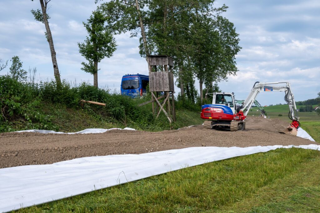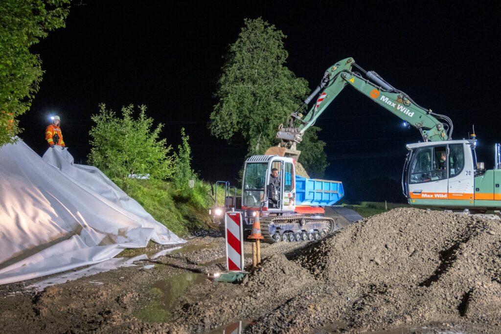Leutkirch – Die Anwohner können aufatmen: Die Dammsicherungsarbeiten am Taufach-Fetzach-Moos bei Urlau, die vergangene Nacht (5.6./6.6) begonnen wurden, sind abgeschlossen und werden von Experten als sicher bewertet. Es konnten innerhalb kürzester Zeit 3500 Tonnen Frostschutzkies und 6000 m² Vlies verbaut werden, um den Damm zu stabilisieren. Die Feuerwehr Wuchzenhofen hat zusätzlich gut 3500 Sandsäcke am Damm angebracht.