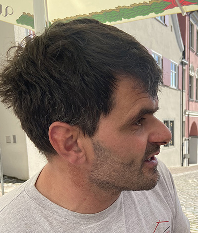 Seine Bewerbung zur OB-Wahl kam durch eine „Zufallsbekanntschaft“ mit dem Leutkirch-Ausnanger Stadtrat Daniel Krug von den „Unabhängigen“ (DU) zustande. Krug (Bild) erklärte am späten Nachmittag des 13. Mai auf der Freilufterrasse des Cafés „Bock“, er halte es für geboten und sinnvoll, dass bei einer Wahl mehrere Personen antreten: „Eine Wahl ist nur eine Wahl, wenn es Auswahl gibt.“ Insgesamt 13 Leute saßen an jenem Montagnachmittag mit dem Kandidaten Franz Josef Natterer-Babych zusammen. Sie sprachen unter anderem die Marktstraße, die Mohrenbrücke, Kreisverkehre und Energiefragen an.