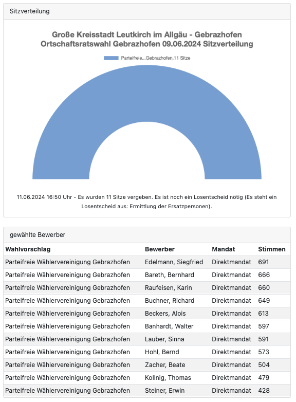 Gebrazhofen (rei) – Elf Mitglieder hat der Ortschaftsrat Gebrazhofen. Stimmenkönig ist Ortsvorsteher Siegfried Edelmann; auf ihn entfielen 691 Wählervoten. Auf Platz zwei rangiert Bernhard Bareth (666 Stimmen). Nachstehend das Ergebnis der Ortschaftsratswahl von Gebrazhofen, entnommen der Webseite der Stadt Leutkirch: