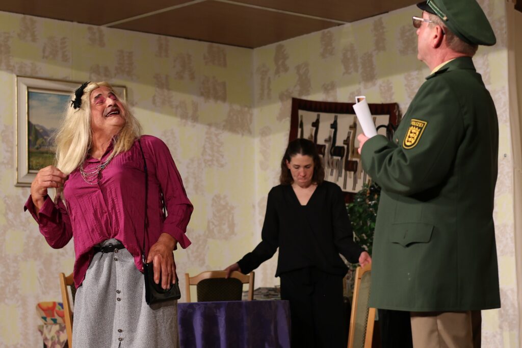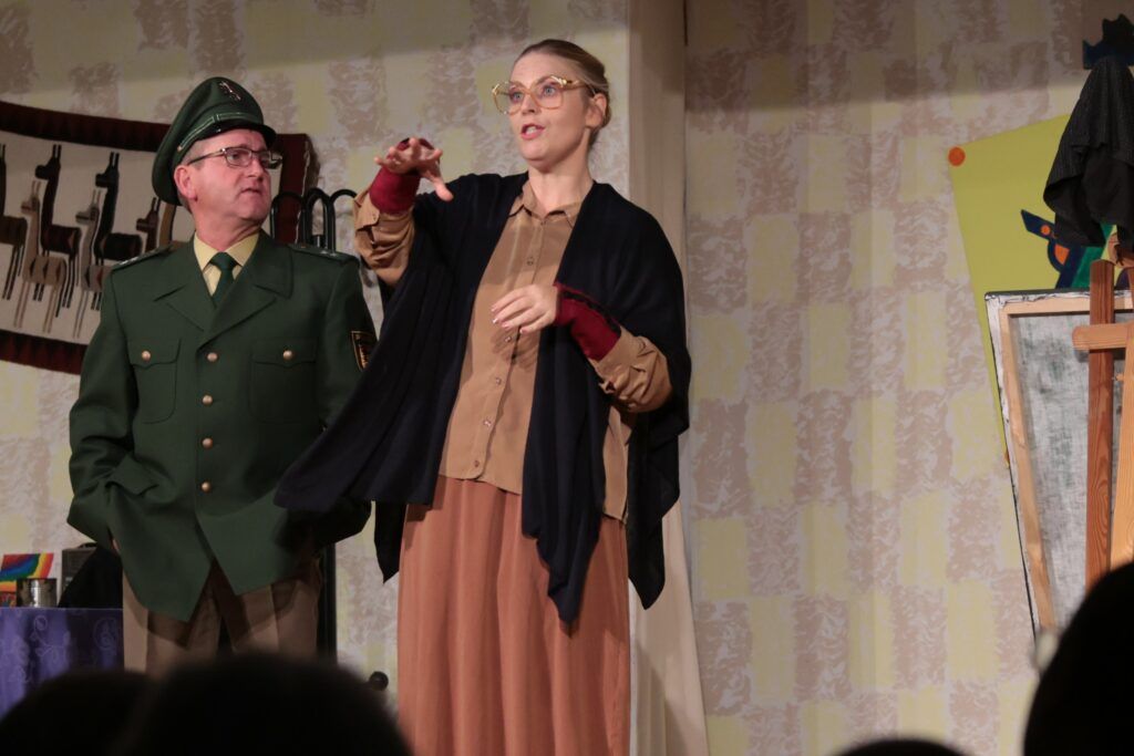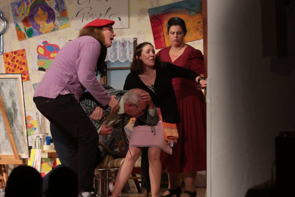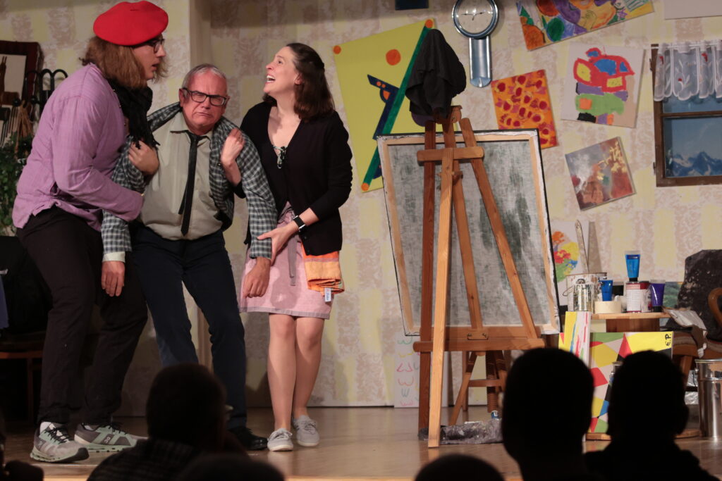 Dann geht der Vorhang auf für eine kurzweilige Komödie (Regie: Steffi Gärtner) um einen armen Kunstmaler (in der Hauptrolle: Michael Günter) und seine prekäre Finanzlage. Wenn bei ihm mal Besucher klingeln, dann ist es allenfalls der Gerichtsvollzieher (Jürgen Frehner) oder die neugierige Nachbarin (Claudia Willburger) oder ein kunstinteressiertes Paar, das aber nicht viel bezahlen will. Meister Pinselo hat dafür kein Verständnis, denn der Monet hat ja auch mit seiner Kunst Moneten gemacht. Die Schwiegermutter (Ramona Wallenfels) sieht ihn als Graffiti-Heini, der wohl nackte Frauen für den Playboy malt. Das sei doch Sodom und Gomorrha. Er solle doch wieder als ehrbarer Malermeister um Aufträge gucken, denn auf dem Tisch stapeln sich die unbezahlten Rechnungen. Doch der nackte Hintern der Nofrätäte – ja, so nennt er das Objekt seiner „Kunst“ – soll das Geld bringen. Natürlich ist sein Ruf lädiert; es heißt, Meister Pinselo hätte nicht mehr alle Farben im Kasten.