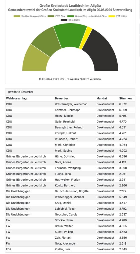 Bad Waldsee (rei) – 37,0 Prozent für die CDU, 21,6 Prozent für das Grüne Bürgerforum, 19,7 Prozent für die Freie Wählervereinigung (FWV), 19,1 Prozent für Die Unabhängigen (DU) und 2,7 Prozent für die FDP – das ist das Ergebnis der Gemeinderatswahl in Leutkirch. In Sitzen drückt sich das so aus: CDU 9 Sitze, Grünes Bürgerforum 6 Sitze, FWV 5 Sitze, DU 5 Sitze und FDP 1 Sitz. Stimmenkönigin ist Dr. Brigitte Schuler-Kuon, die 7272 Stimmen auf sich vereinigen konnte – sie ist die einzige, die die 7000er-Marke überschritten hat. „Sechstausender“ sind Gottfried Härle (Grünes Bürgerforum; 6596) sowie Waldemar Westermayer (6372) und Christoph Krimmer (6069), beide CDU. Nachstehend die Sitzverteilung im Diagramm und die Ergebnisliste, der Webseite der Stadt Leutkirch entnommen (dort eingestellt um 18.29 Uhr):