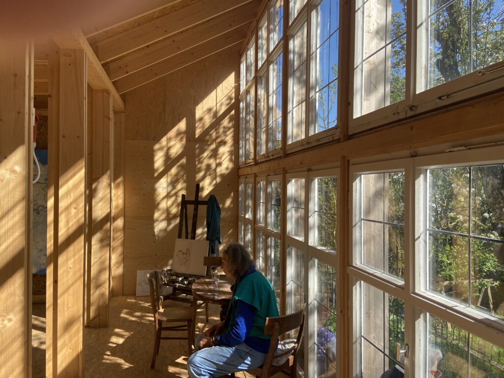 Glas und Holz, alte Fenster und nachhaltiger Baustoff: Blick ins Innere des Ateliers.