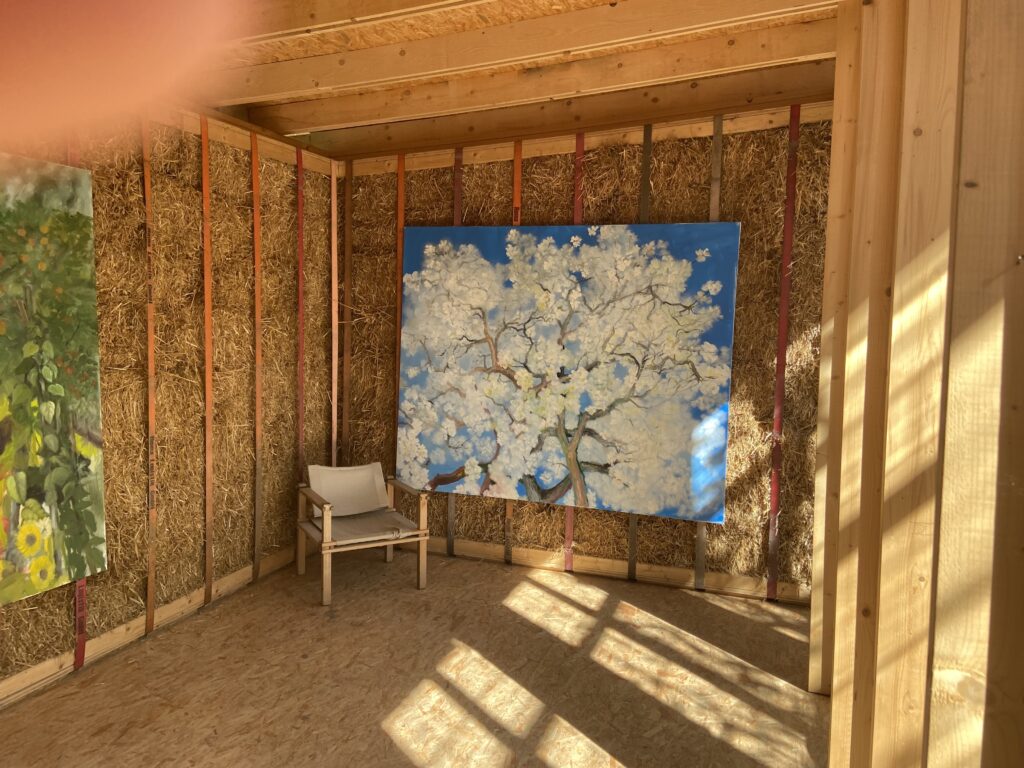 Den Baustoff Holz und Stroh für das neue Atelier lobte OB Henle als „gespeicherte Sonnenenergie“. Leutkirch als Stadt mit dem größten gemeindeeigenen Waldbesitz im Landkreis Ravensburg habe selbst schon Kindergärten in Holz errichten lassen. „Und die Erzieherinnen sagen mir: ,Da sind die Kinder ruhiger.‘ “ Ähnlich Dorothea Schrades neues Atelier: „Wenn man in das Gebäude reingeht, dann spürt man das auch.“ Beieindruckend, wie dort „alte Baumaterialien genutzt“ worden seien. Das trage zur Nachhaltigkeit des Gebäudes bei.