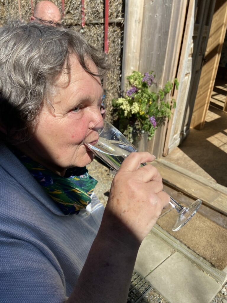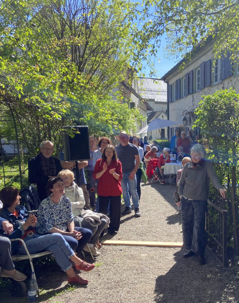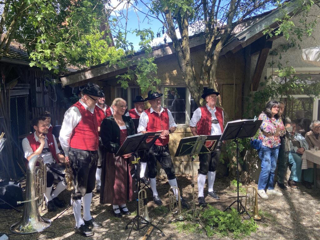 Hans-Jörg Henle freute sich, dort sprechen zu dürfen, „wo die Kirche noch im Dorf steht“. Direkt nebenan: Dorothea Schrades Galerie. Und dahinter das neu errichtete Atelier. Dessen Wände bestehen hauptsächlich aus gepresstem Stroh. Und dazwischen unter blühenden Bäumen und zwischen Blumen: die Musikkapelle Diepoldshofen. Sie sei gerade „preisgekrönt“, berichtet der OB.
