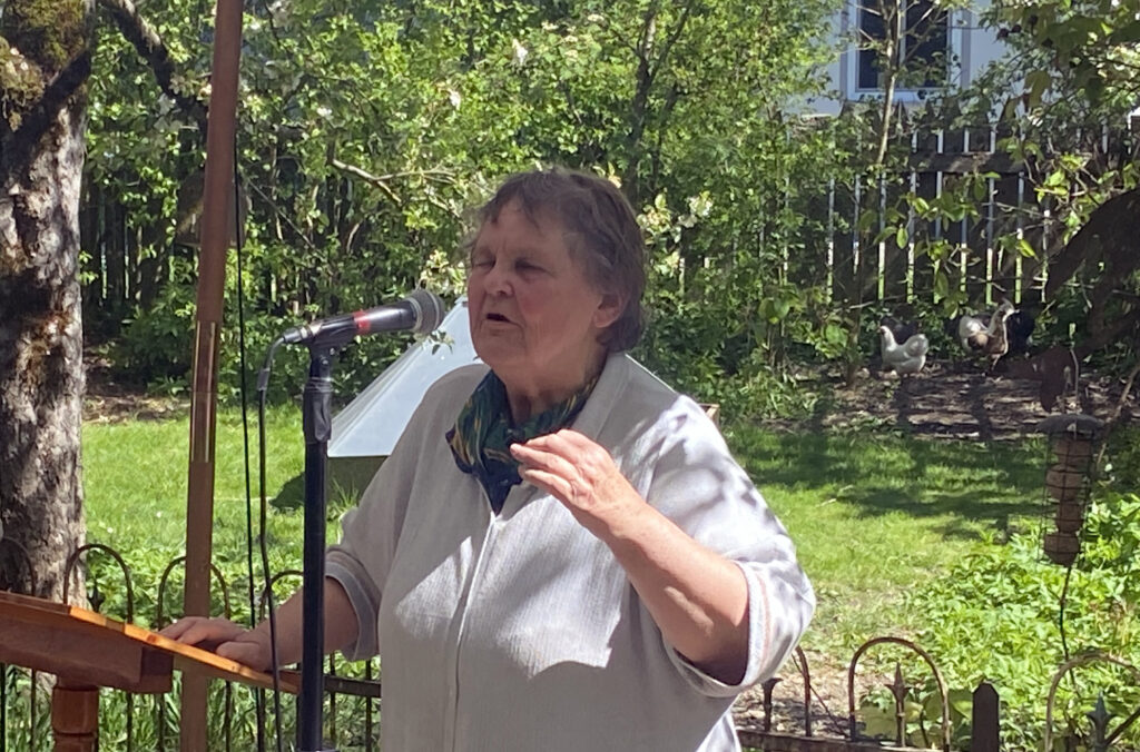Diepoldshofen – Samstagnachmittag, 27. April, um etwa 15.00 Uhr neben dem Pfarrhaus Diepoldshofen. Bienen summen, Vögel zwischtern, Leute lachen – und dann tönt sie laut und schmissig: die Musikkapelle Diepoldshofen. Kein Zweifel: Hier wird etwas gefeiert. Und zwar die Verleihung des Hugo-Häring-Preises an das neue Atelier der Malerin und Kunstaktiven Dorothea Schrade. Neue Ideen und alte Baumaterialen zeigen dieses Haus als „ein Stück Zukunft in der Gegenwart“. Im vergangenen Jahr war Dorothea Schrade der Preis zuerkannt worden; jetzt wurde gefeiert. Mit Architekt und OB.