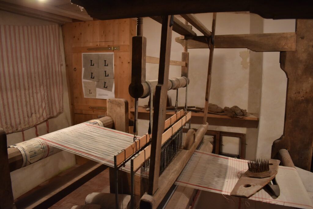 Nochmals geht es bergauf – zur Schneegasse, zur Weberdunk. Auweia – das ist ja ohne Halloween schon unheimlich. Im hellen Licht sieht man einen traditionellen Webstuhl, Leinenkleider hängen an der Wand. Plötzlich öffnet sich eine Seitentüre und knallt wieder zu – der schwarze Mann.