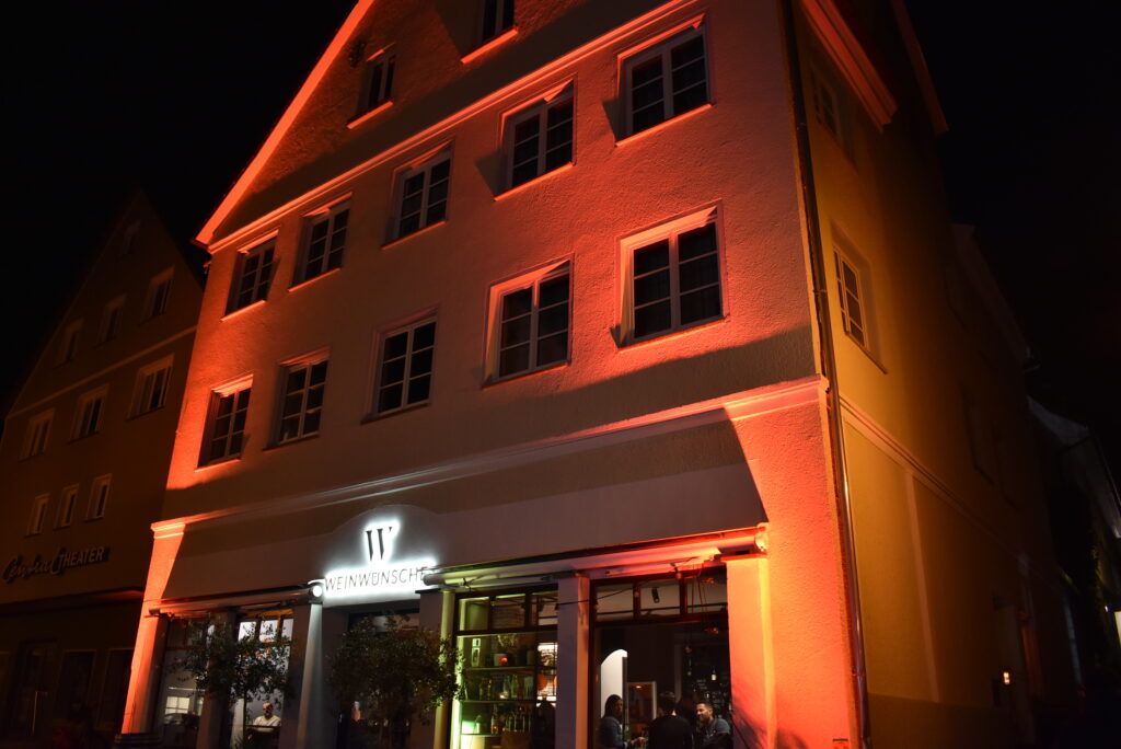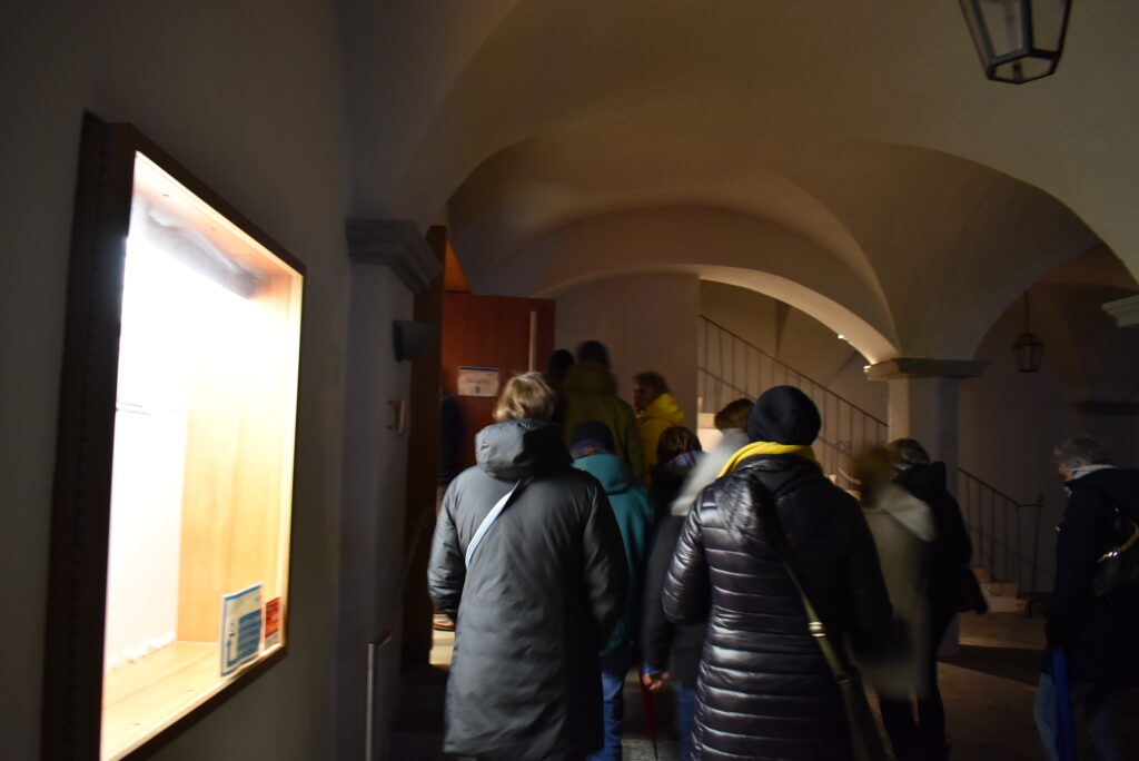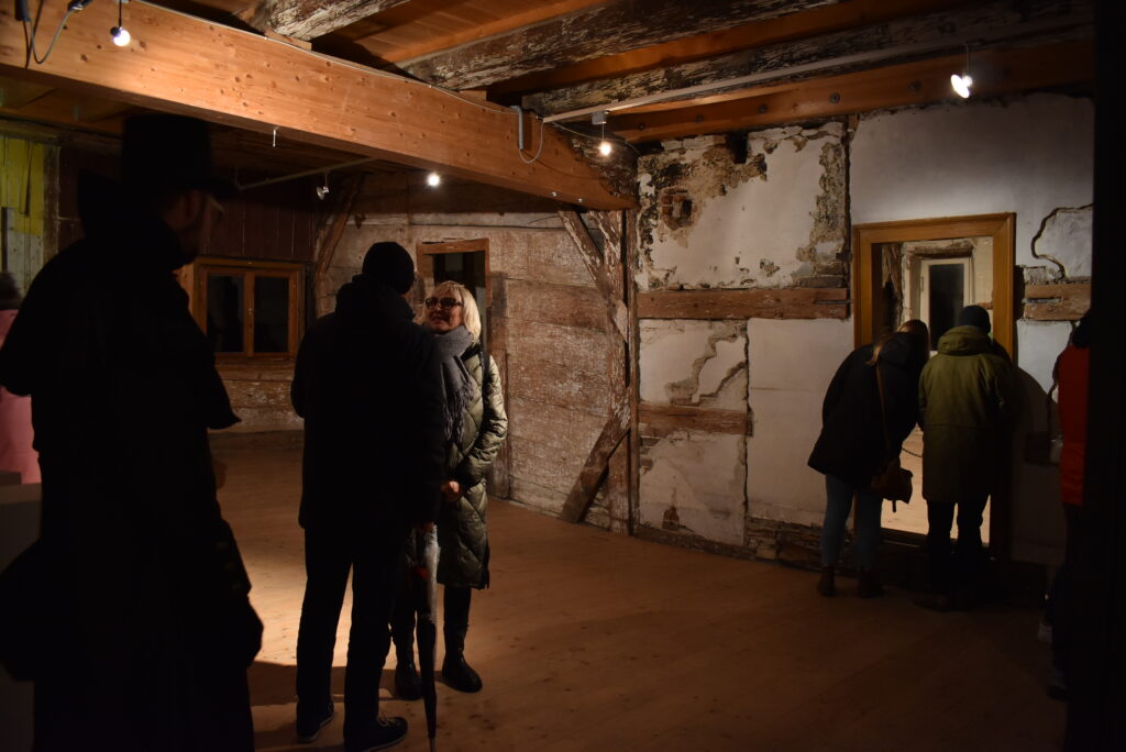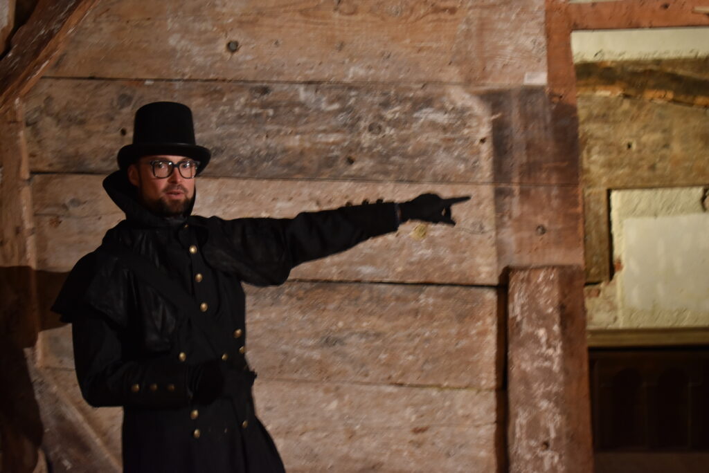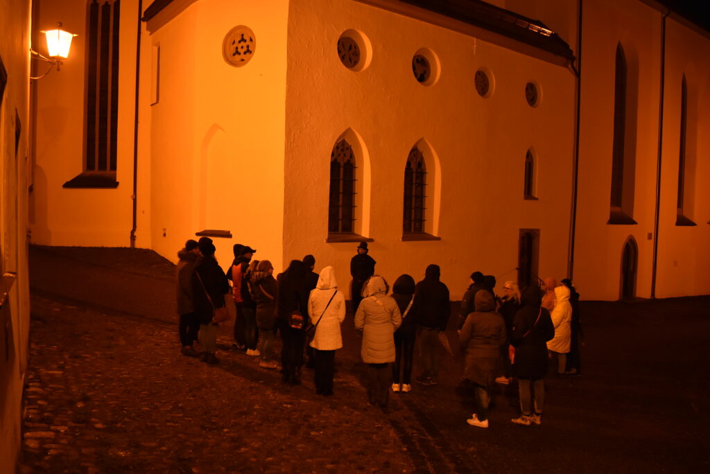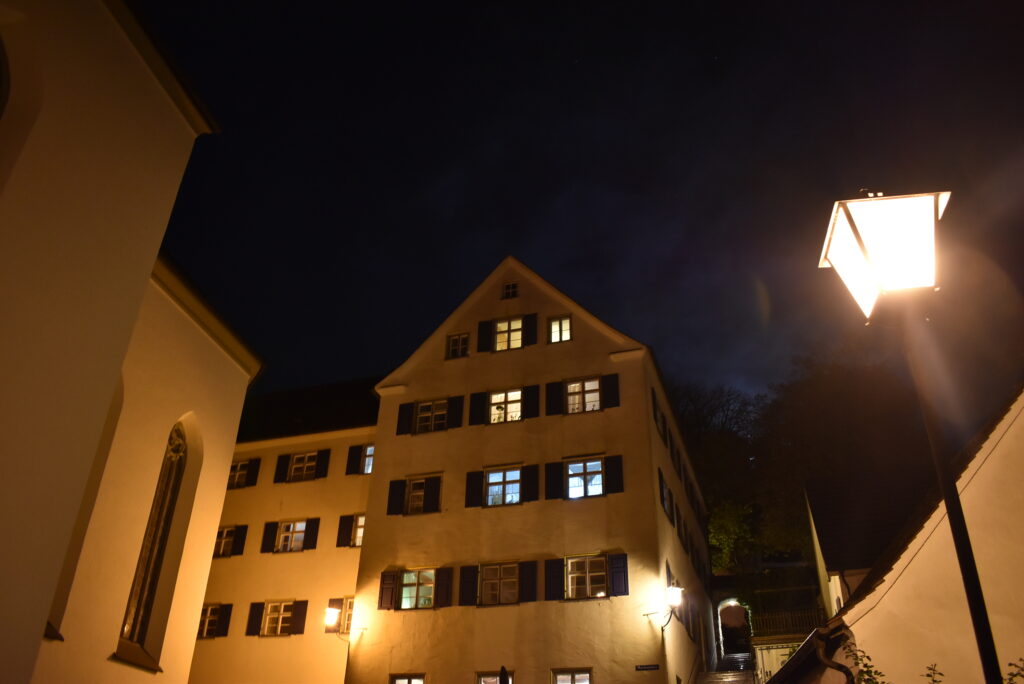Im Feuerschein beginnt Wandinger zu erzählen, vom ältesten Haus in Leutkirch, dem über 600 Jahre alten Gotischen Haus, ein Holzbau, dem das Alter nur von der Rückseite anzusehen ist. Ein paar Lichter brennen innen, die Gruppe steigt die Stiegen zum zweiten Stock hinauf. Hier ist nicht mehr alles im Lot, der Holzboden knarrt ein wenig unheimlich. Tatsächlich – ein Aufschrei – hier spukt der gotische Geist in einem abgelegenen Raum, ein Arm langt nach neugierigen Besuchern. Huch.