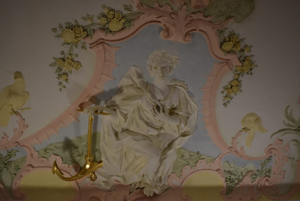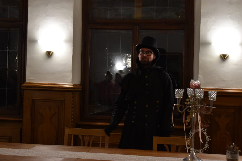 Spannend wird es wieder im Rathaus bei Nacht. Spärliche Beleuchtung und seltsame Geräusche verheißen nichts Gutes. Stephan Wandinger erklärt das Gebäude und wie es zu den Leutkircher Stadtfarben blau-gelb kam. Plötzlich poltert es hinter Türen, das Licht geht kurz aus. Dann großes Staunen: Der Schwörsaal mit seiner wundervollen Stuckdecke – ein wahres Schmuckstück, der ganze Raum in stilvollem Ambiente. Viele Paare haben hier schon geheiratet, auch einige aus dieser illustren Halloween-Gruppe.