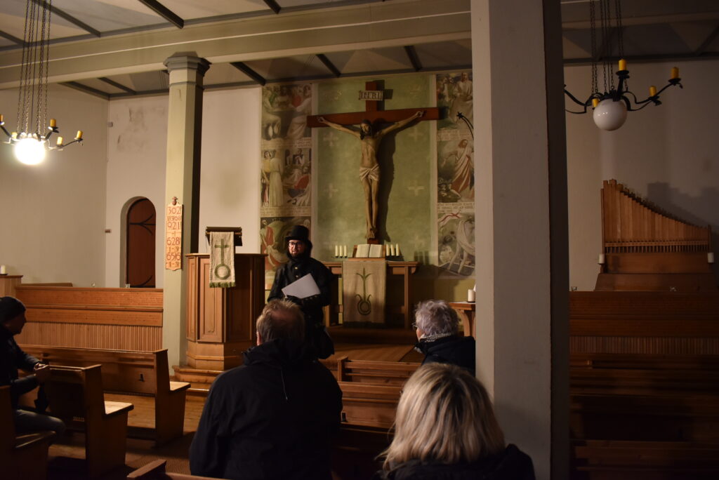 Am Oberen Graben angekommen, wird die große Grundschule erklärt, mit dem wohl schönsten Ausblick aufs Umland. Dann führt ein schmaler Weg zum Marienplatz. Die St. Martinskirche, das Kloster und der Platz sind in orangenes Licht getaucht. Wandinger erzählt von den armen Franziskanerinnen, spricht über den Pulverturm, über die Leutekirche. Der Mond lugt hinter der Wilhelmshöhe hervor. Passend zur Stimmung geht es nun um Hexenverbrennungen in der Region. Ein Aufschrei. Eine Hexe schleicht sich durch die Gruppe und wie ein kurzer Spuk ist sie auch schon wieder verschwunden.