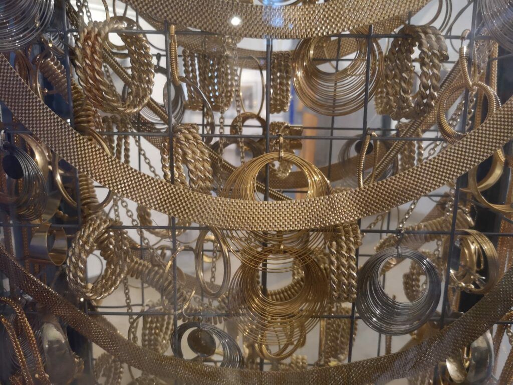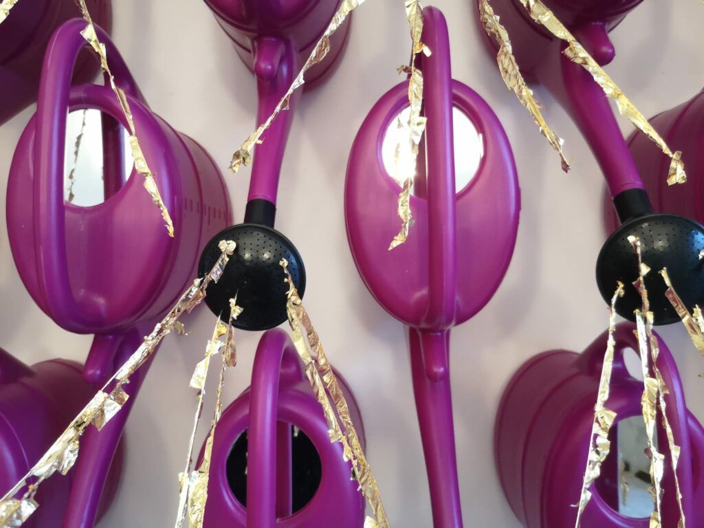 In dieser Arbeit wird ein wichtiger Aspekt noch einmal besonders deutlich greifbar, der sich wie ein roter Faden durch das Schaffen von Erwin Roth zieht. Es ist sein empathisches, mitfühlendes Sich-Beziehen auf die Welt, auf ihre Probleme und ihre Katastrophen. Auch ein Wandobjekt, für das Pressemeldungen zum Tsunami von 2004 in Wachs mit Lavagestein versiegelt wurden, weist in diese Richtung. Das Problem der Verknappung und Kommerzialisierung der Ressource Wasser ist dann das Thema einer anderen Arbeit. „Goldwater“ ist sie sprechend betitelt und empfängt den Besucher bereits in der Vorhalle des Hofgartensaals.