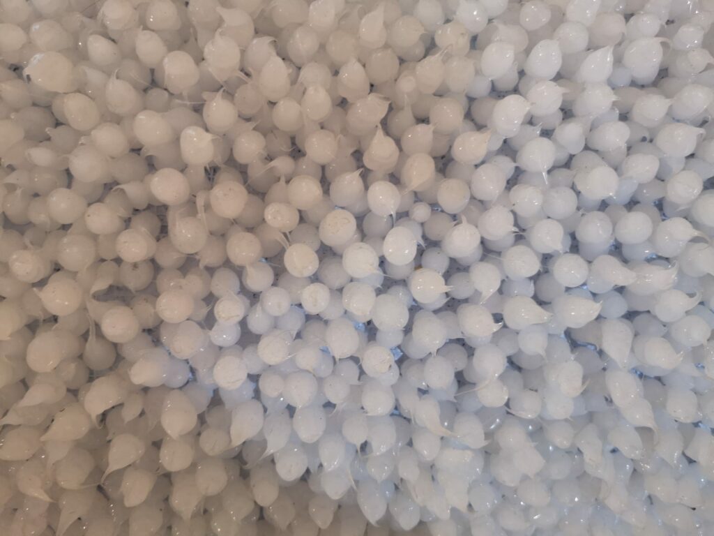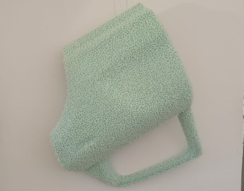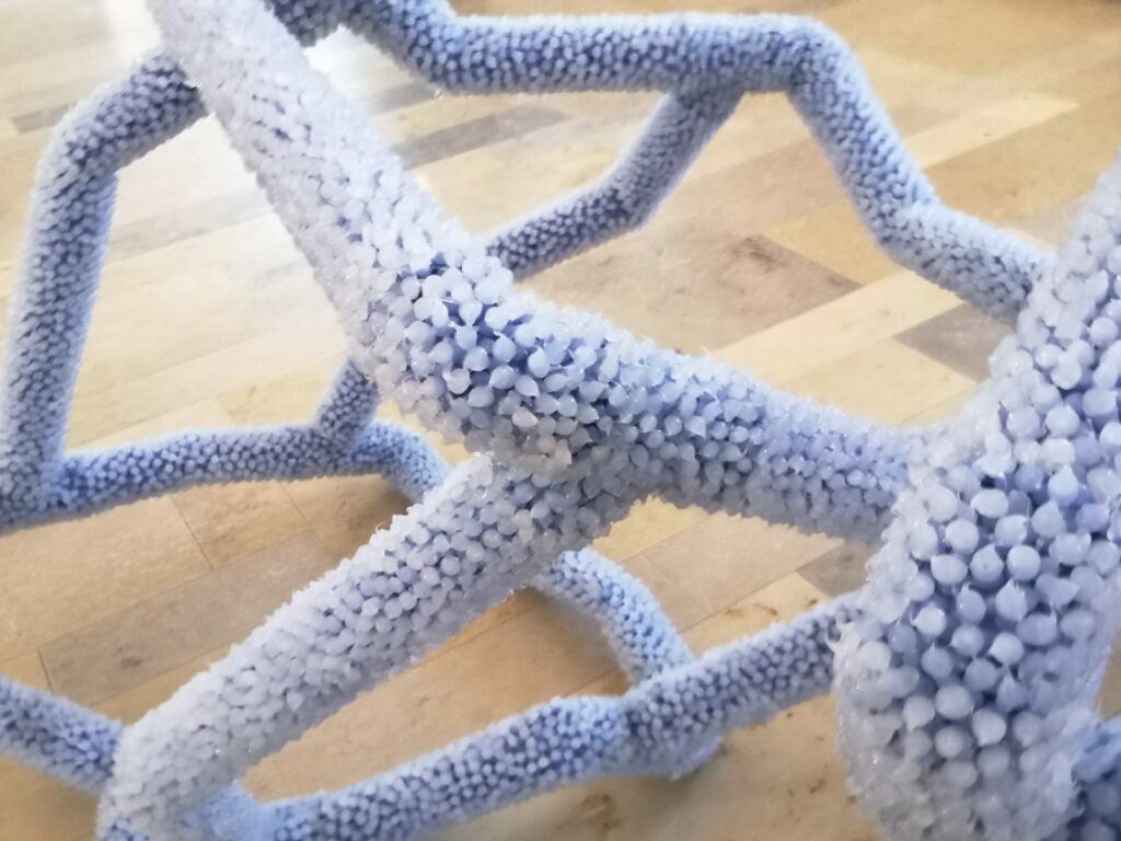 Betritt man die weite gewölbte Halle des Hofgartensaals, so empfängt einen zunächst eine große Gruppe der neuesten Arbeiten des Künstlers. Es sind durchweg großformatige Skulpturen und Wandobjekte, in denen jeweils ein farbiger Kern von weißen Silikontropfen überzogen, ja fast überzuckert wird. Dieser Pelz von Silikon hat einen reizvollen Effekt. Er nimmt den abstrakten, oft spitzeckigen Formen ihre Schärfe und gibt ihnen eine Art Sfumato, eine weiche, sinnliche Anmutung, die einen fast dazu verlockt, die Objekte zu streicheln.