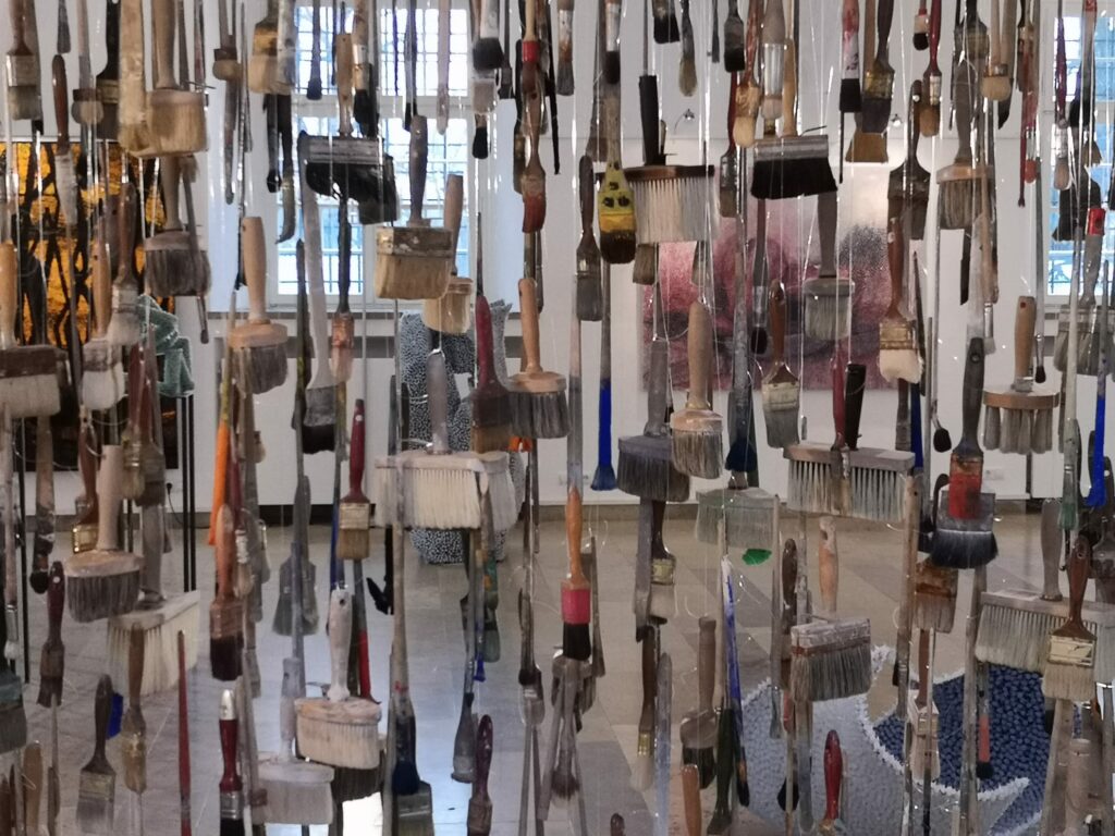 Wenn der Besucher weiter in die Halle hineingeht, so wandert er dabei gewissermaßen im Schaffen Erwin Roths zurück durch die Jahrzehnte. Und wenn er dann an der Innenhofseite des Saals zum Eingang zurückkommt, so ist er schließlich bei den ersten Anfängen des Künstlers angelangt, zwei kleinen Ansichten von Kempten bzw. Martinszell in naturalistischer Ölmalerei. Von diesen Bildern war es ein weiter Weg zu den Silikonobjekten. Aber wenn man durch die Ausstellung geht, kann man diese Entwicklung anschaulich nachvollziehen. An vielen Stellen kann man dem Künstler gewissermaßen dabei über die Schulter zuschauen, wie er seine Themen über die Jahre weiterentwickelt hat. Dabei nutzt er die unterschiedlichsten künstlerischen Ausdrucksformen: unter anderem klassische Malerei, klassische figurative Skulptur, abstrakte Skulptur, Materialbilder. Und eine der Arbeiten setzt sich sogar für zwei, drei Minuten in Bewegung und sorgt auch für etwas Lärm. Ein breiter Vorhang von gebrauchten Pinseln unterschiedlicher Form und Größe beginnt dabei zu zittern.