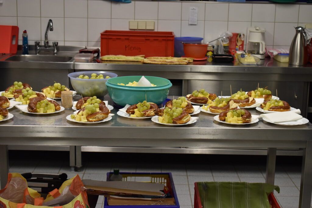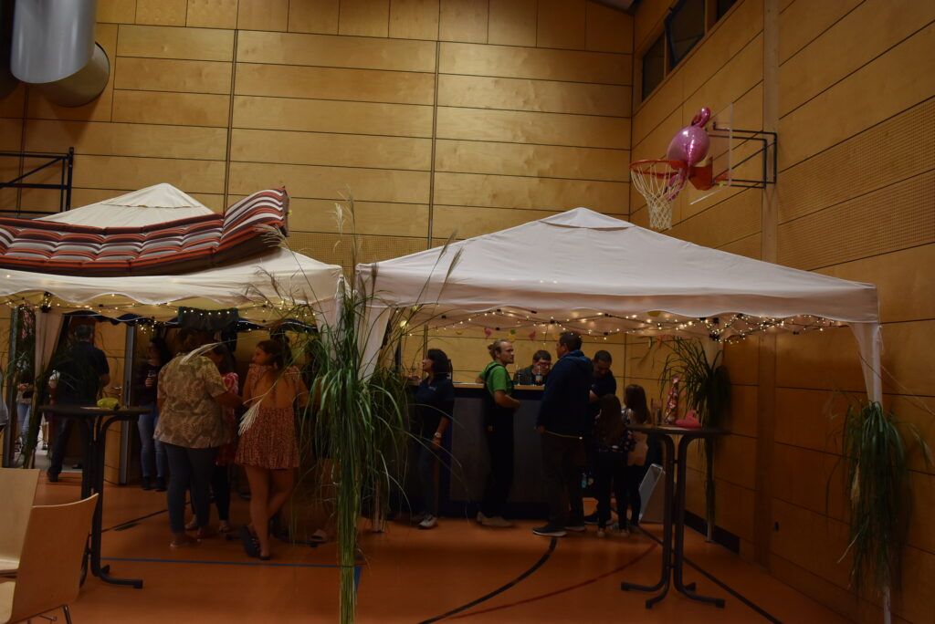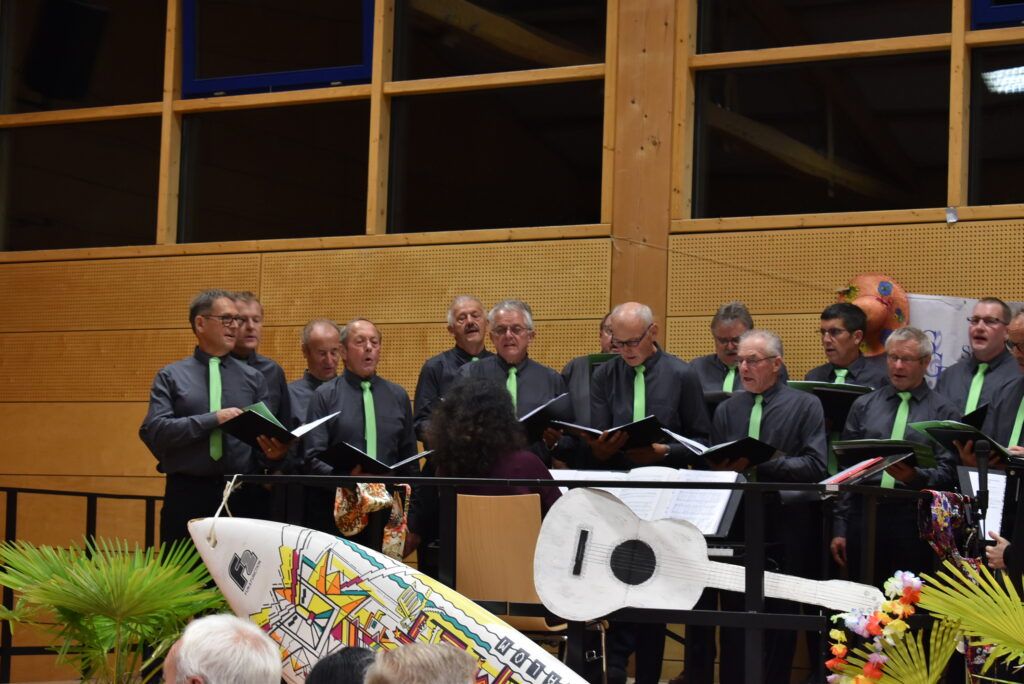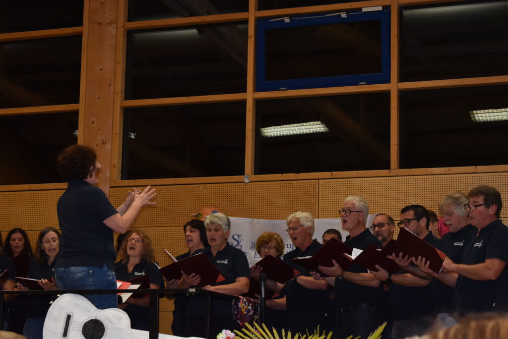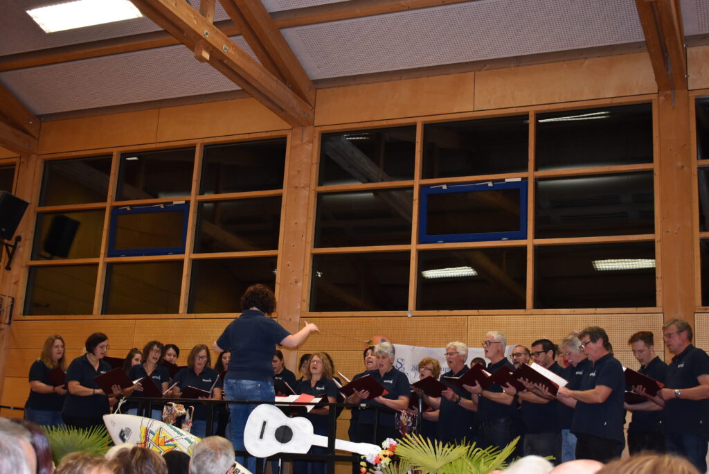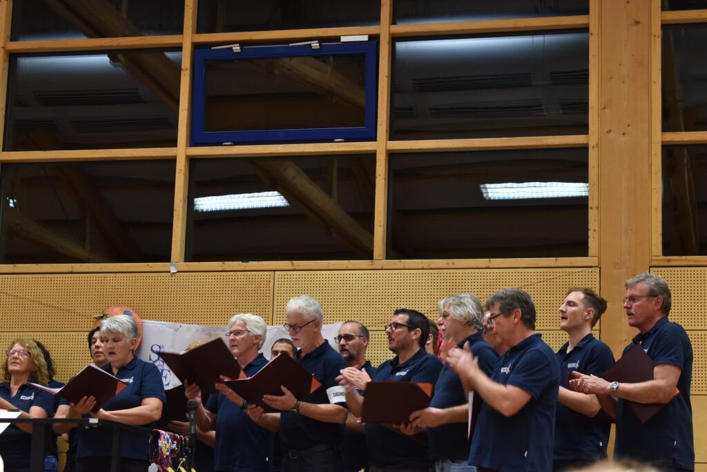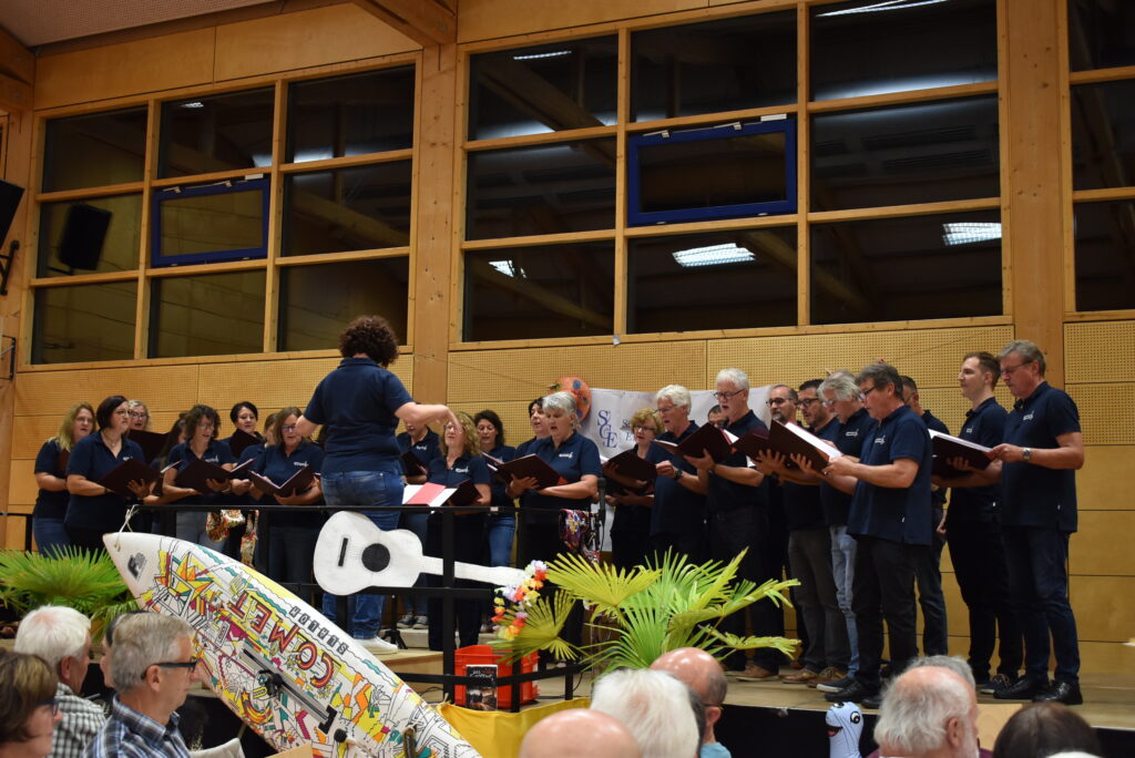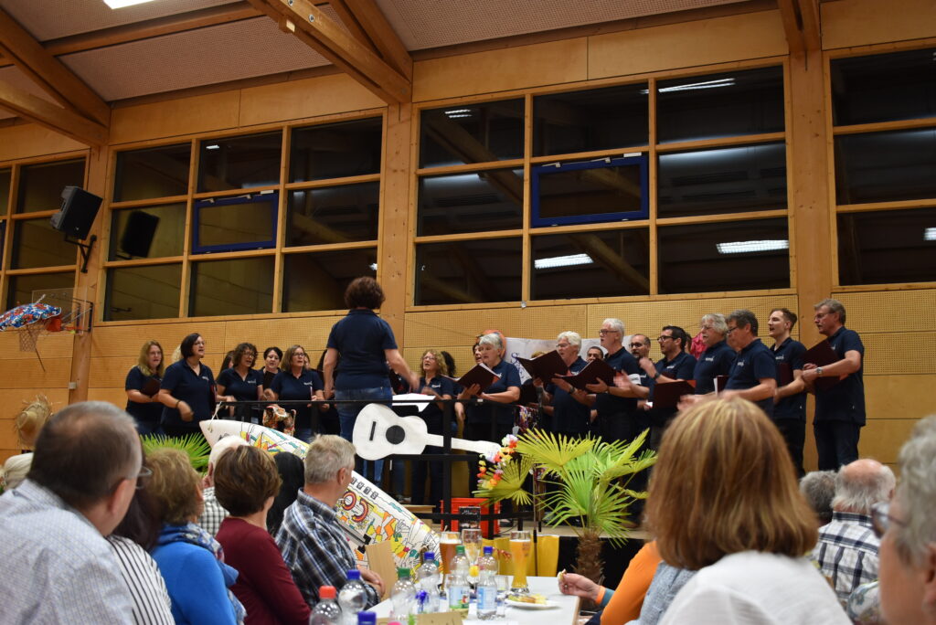 Für Getränke und Bewirtung sorgten Familien und Freunde der Sängergruppe, die mit gut 30 Sänger/innen dann die Bühne betrat. Begleitet von Ingrid Menig am Piano und anderen Instrumentalisten gab es ein buntes Programm an fröhlichen Stimmungsliedern, darunter „Lass die Sonne in Dein Herz“, sowie den bekannte Hit „Ein Stern, der Deinen Namen trägt“. Nach einem stimmungsvollen „Ehrenwort“ durfte man wieder eine Pause mit leckeren Seelen genießen.