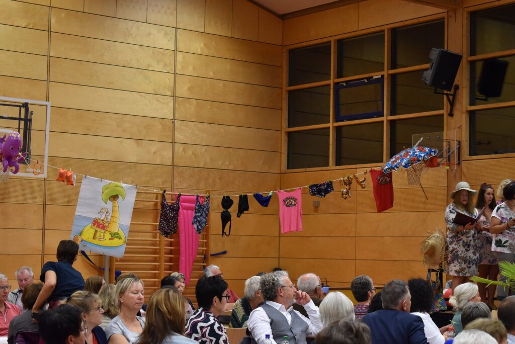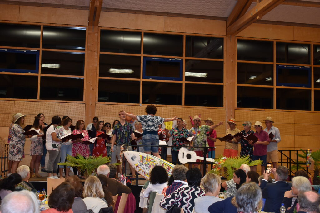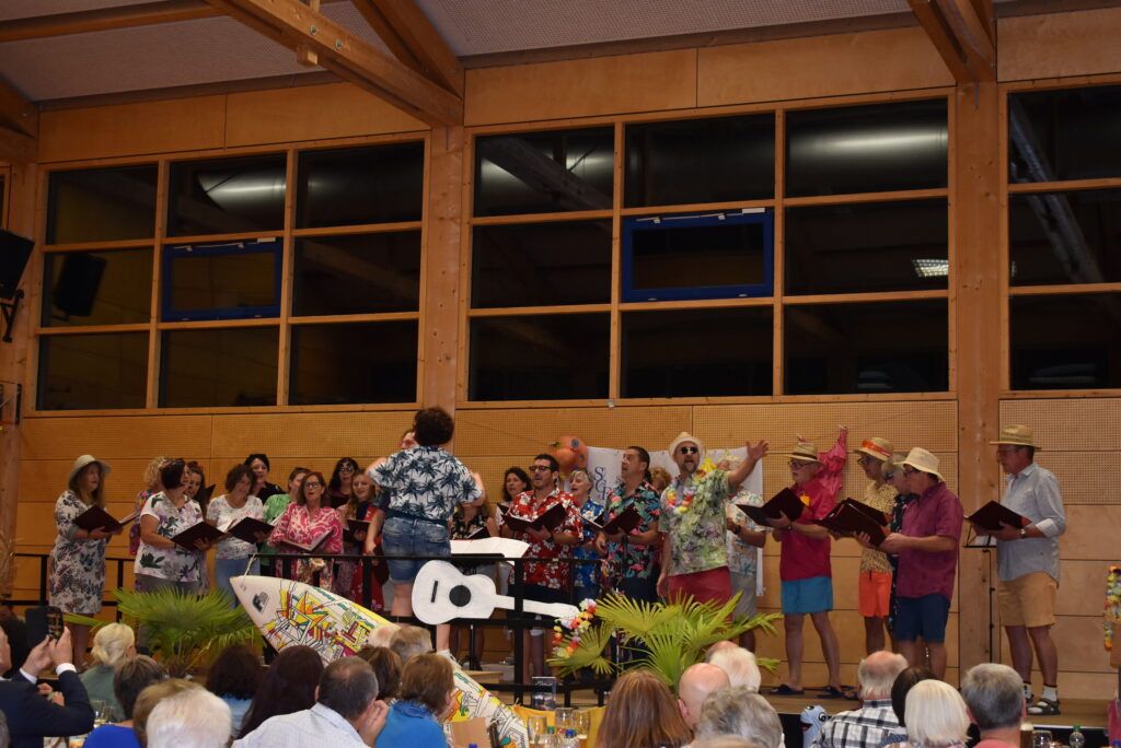 Tobias Stohr, Sohn der Chorleiterin aus Engerazhofen, dankte allen Besuchern, Sänger/innen, den vielen Helfern und DJ Franzi, der den letzten Part des Abends übernahm. Zuvor hatte die Sängergruppe noch eine Überraschung parat: Alle kamen in unterschiedlichen Urlaubs-Outfits, in Shorts und Hawaii-Hemden, mit Sonnenhut und -brille und luden mit „Lollipop“ gleich zum Mitsingen und Mitschnippen ein. „Surfin‘ USA“ von den Beach Boys durfte nicht fehlen und „La Bamba“ mit einigen kräftigen ARIBA –Zwischenrufen, ebenso der berühmte „Izibizi-tiniwini-Strand-Bikini“, der wohl nie getragen wurde.