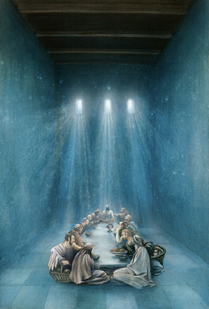 Die anspruchsvollste Arbeit, vor die sich Friedrich Hechelmann je gestellt sah, war seine Bebilderung des Alten und Neuen Testamentes. In diesem Bewusstsein schuf der Isnyer Künstler 50 Illustrationen, bei denen sich Umsetzung der biblischen Botschaft und Weltoffenheit in Glaubensdingen die Waage halten. In der Galluskapelle spiegeln ab Palmsonntag sieben signierte DIN-A1-Großdrucke das Geschehen von der Passion bis Pfingsten.