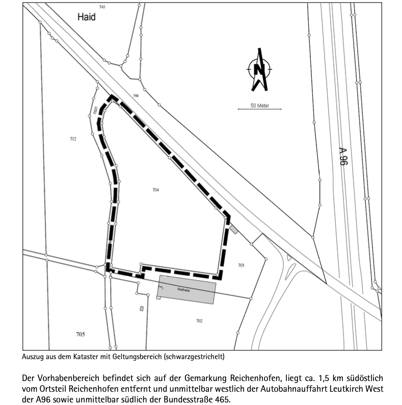 Direkt südwestlich der Bundesstraße 465 von Leutkirch Richtung Bad Wurzach. Dort soll sich das Freiland-Sonnenstrom-Kraftwerk auf einem Gelände von 1,73 Hektar ausbreiten. Geplante Leistung: 1800 bis 2000 Kilowatt. Also über 1.500.000 elektrische Kilowattstunden im Durchschnitt jährlich. In etwa so viel wie tausend Privatpersonen pro Jahr verbrauchen.