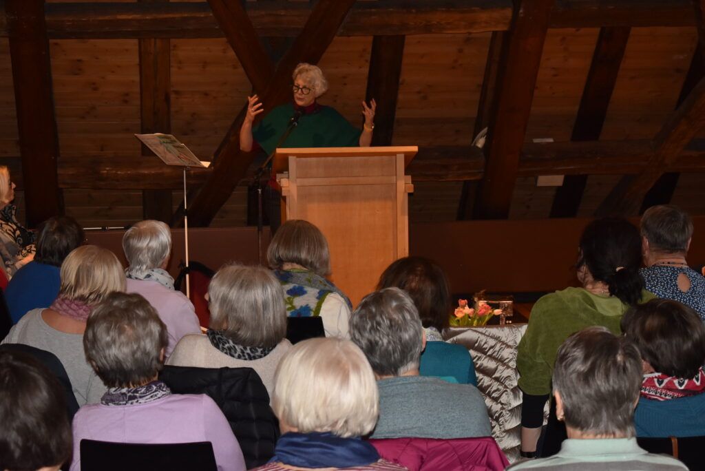 Referentin des Nachmittags war Gertrud Geiger (Bild) aus Tettnang, Supervisorin und Coach, die rasch die Herzen der rund 85 anwesenden Frauen aus Leutkirch um Umgebung eroberte, nicht zuletzt durch ein altes Örgeli von ihrem Opa, mit dem sie ein paar Lieder spielte, zur Freude der Besucherinnen.