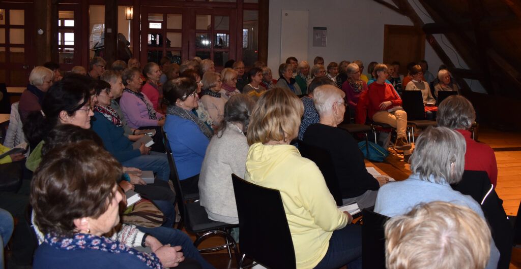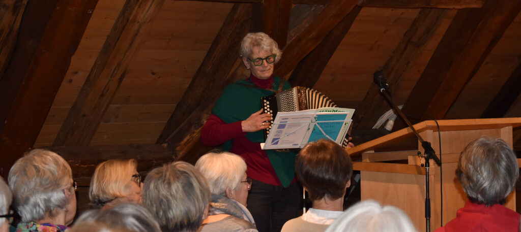 „Trotz aller Sorgen und Nöte, lasst Euch nicht bekümmern und entmutigen durch schlechte Nachrichten, macht Musik, seid fröhlich und kommt zusammen“, diese Botschaft kam auch mit der Örgeli-Musik von Gertrud Geiger rüber; Musik und Gesang verbindet Menschen, macht Freude. Stress, Hektik, Traurigkeit, Überlastung, Überforderung im Alltag, all das darf die Freude am Leben nicht vertreiben. „Die Freude lebt im Hier und Jetzt“, versicherte die Referentin glaubhaft und erklärte: „Die Freude kann man nicht festhalten, zum Beispiel sieht man das erste Schneeglöckchen im Frühling – man freut sich riesig, der Frühling kommt, aber das ist nur ein Momentgefühl. Das bleibt nicht lang erhalten.