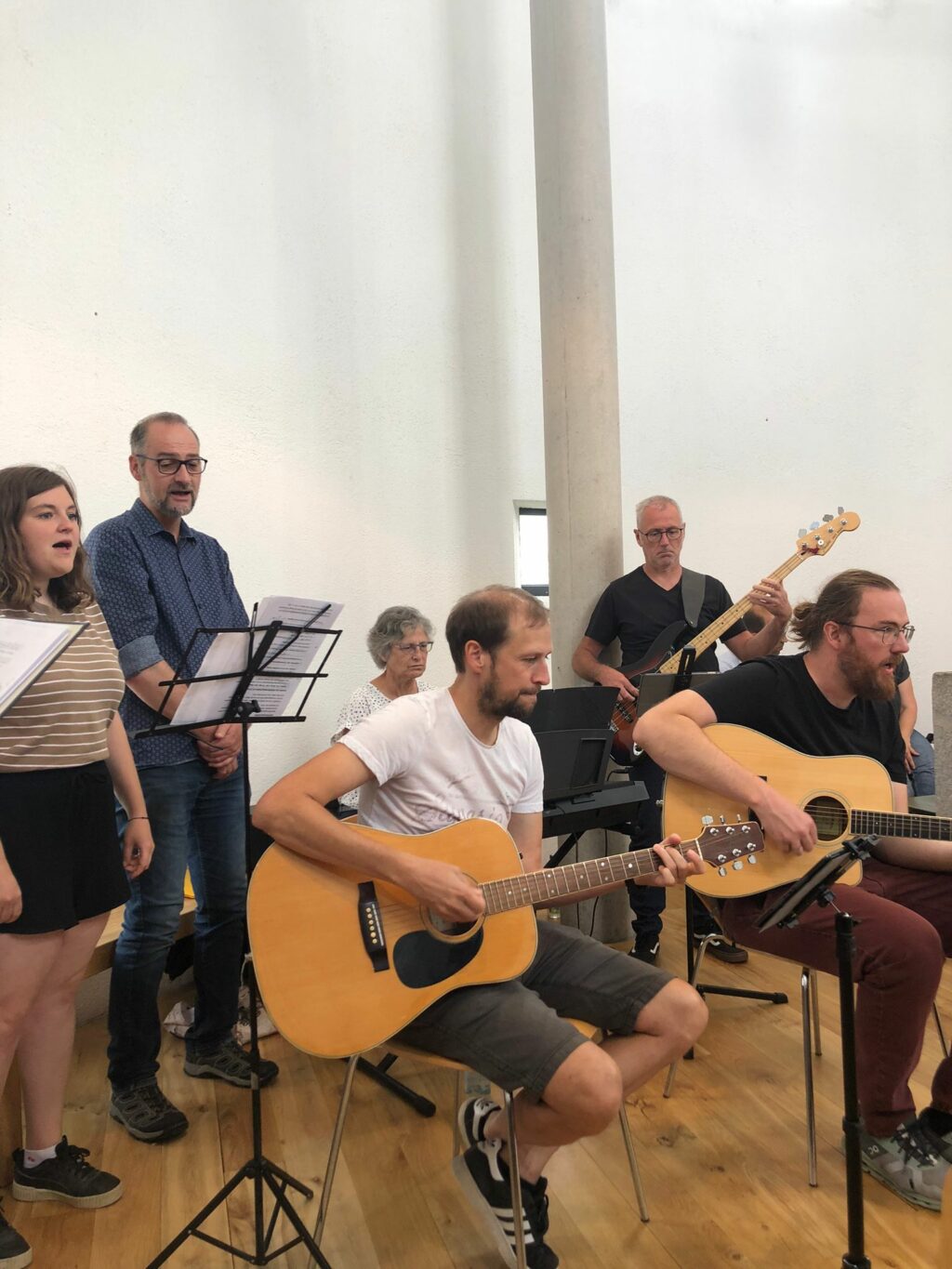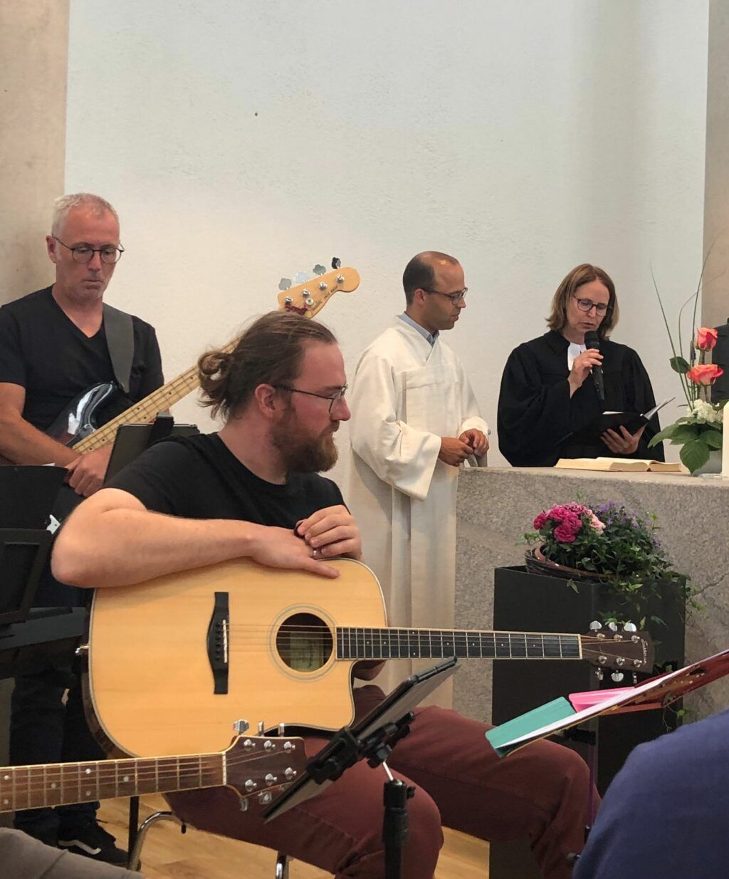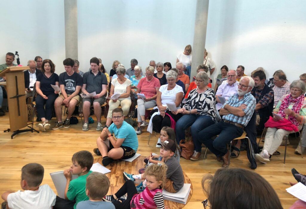 Die Kapelle konnte am Sonntagabend kaum alle rund 80 Besucher fassen, auch viele Kinder waren gekommen, die „bewegte und bewegende Lieder“ präsentierten. Es spielte die Gallus-Kapelle, bzw. –Band mit Gitarren, Keyboard, Querflöte. Aufgrund der unsicheren Witterung hatte man der ursprünglichen Musikgruppe abgesagt.