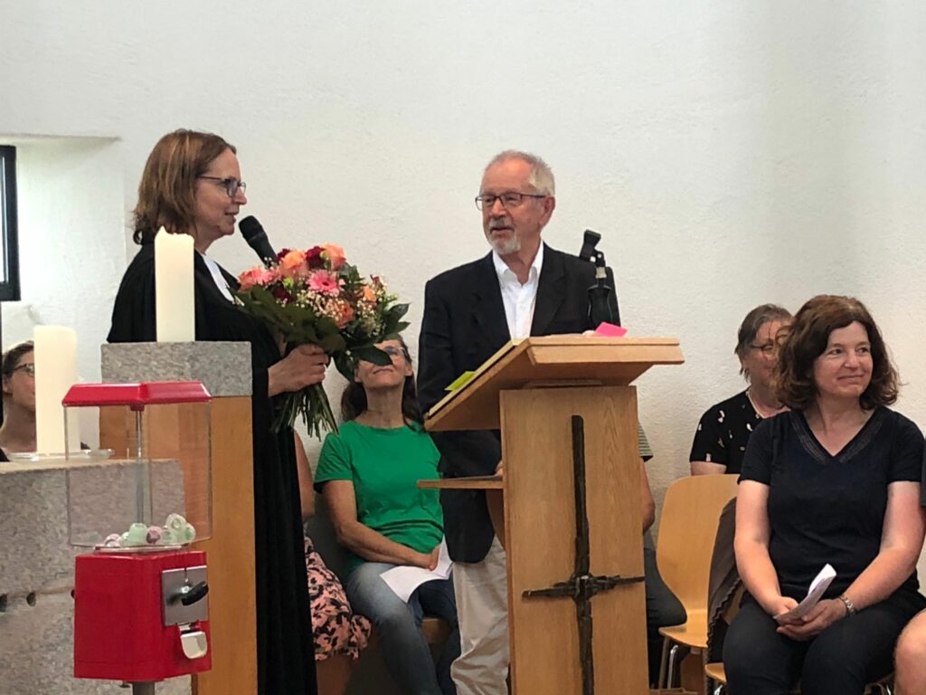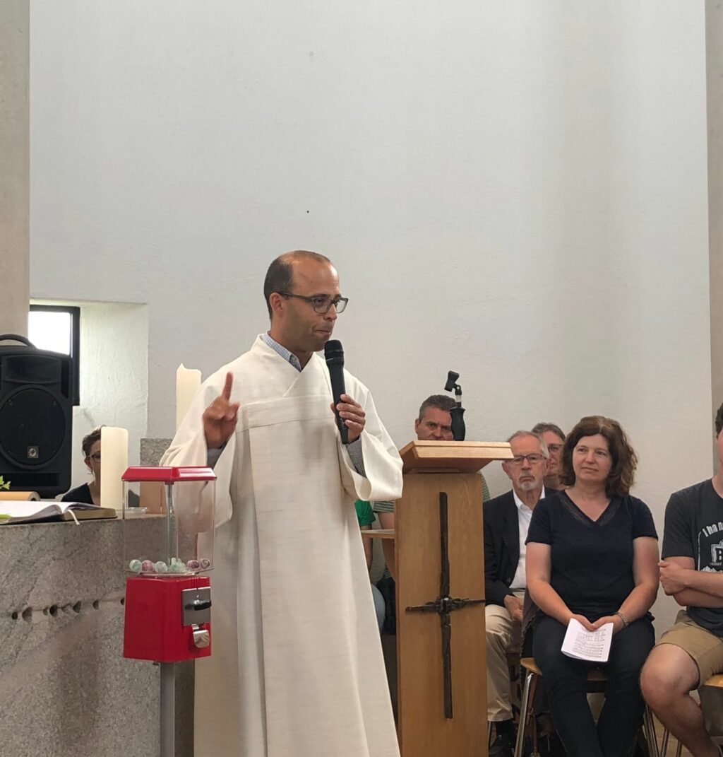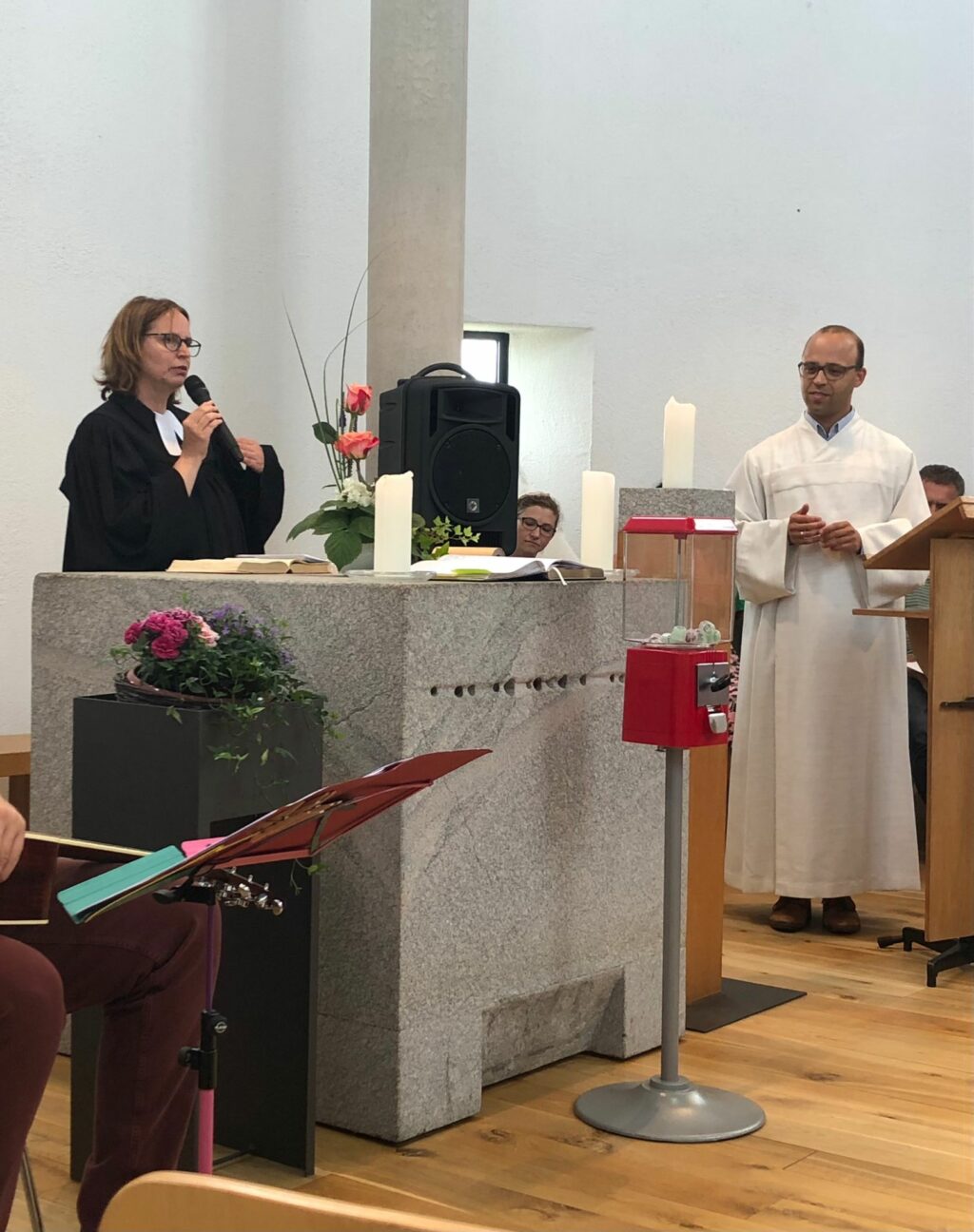 Pfarrerin Ulrike Rose von der Evangelischen Kirche und Pastoralreferent Benjamin Sigg von der Katholischen Kirche gestalteten einen sehr abwechslungsreichen Gottesdienst. Es gab einen Frage-Automat, den die Kinder bedienen durften. Es stellten sich Fragen zum Thema Orte und Plätze, was sie jedem bedeuten, was es für Lieblingsplätze gibt, wie sie interpretiert werden können. Die Sinnfragen daraus waren eindeutig: Wo ist mein Platz im Leben, wo gehöre ich hin, was mache ich aus meinem Leben, was sind Gottes Wege /Aufgaben für mich?