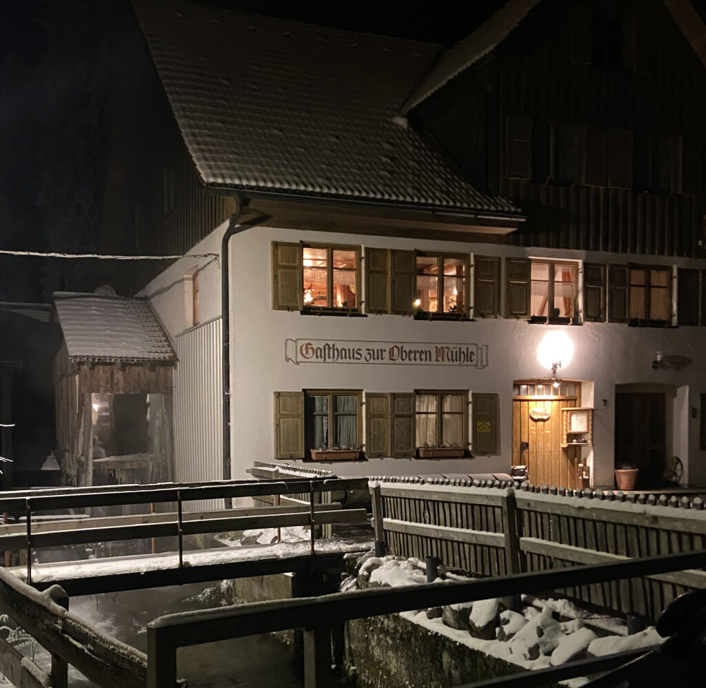 Lockende Wärme: das Gasthaus „Zur Oberen Mühle“ im Winter.