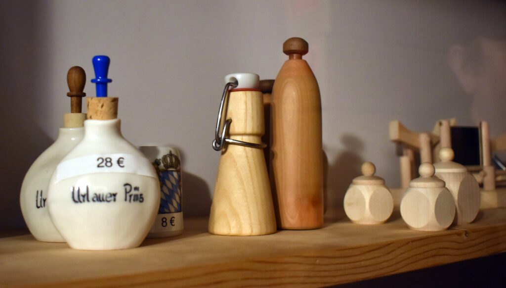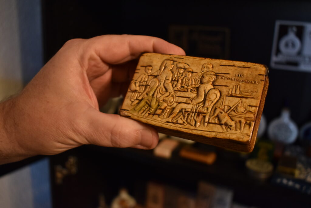Rechts hölzerne Schnupftabak-Behältnisse aus hiesiger Produktion.