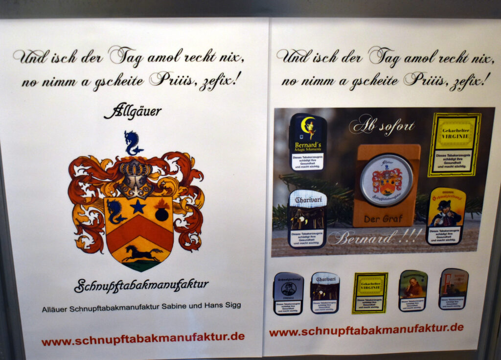 Schnupfen sei Kulturgut, meint Hans Sigg, und es dürfe nicht verlorengehen. Vorbild ist ihm unter anderen die Firma Bernard, die es von 1733 bis genau 2024 in der Nähe von Regensburg gegeben hat. Sie hat die bekannte Marke „Schmalzlerfranzl“ herausgebracht, bestens bekannt, nicht nur bayernweit. Vor 1945 waren es noch rund 300 Mitarbeiter, doch der Bedarf ging immer mehr zurück und letztendlich bedeuteten dieses Jahr neue EU-Gesetze das Aus für den renommierten Schnupftabak-Hersteller.