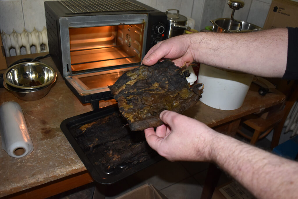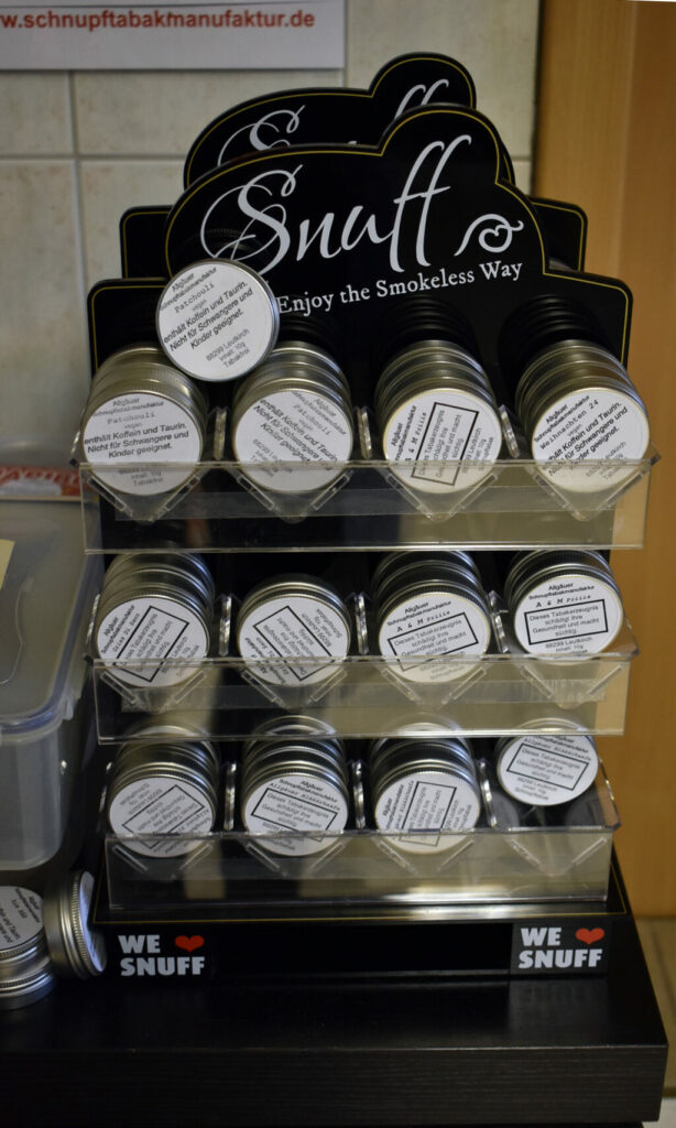 „Durch meine Tätigkeit im Snuff-Store in Kempten von 2009 bis 20024 hab ich gute Kontakte zur Firma Bernard knüpfen können, wir haben Betriebsbesichtigungen gemacht und waren alle immer begeistert“, erinnert sich Hans Sigg an diese schöne Zeit. Im Snuff-Store hat er aufgehört, und sich in Grimmelshofen eine neue Existenz aufgebaut. Hier stellt er selber den Schnupftabak aus brasilianischen Tabakblättern her, die er bei einer bestimmten Temperatur und Zeit fermentieren lässt. Das ganze Geheimnis wird natürlich nicht verraten. Seine geliebte Ehefrau ist seine „End-Verkosterin“, eine Frau aus Gebrazhofen, die seine Liebe zum Schnupfen teilt.