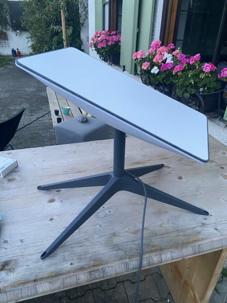 Eine flache, quadratische Platte – etwa 40 mal 40 Zentimeter. Von ihr aus ein Kabel zum kleineren „Router“. Alles in weiß. Die Platte draußen – etwa auf einem Dach. Der Router (eher) im Haus. „Das Ganze funktioniert wie eine Satellitenschüssel“, erklärt Zimmerer Noah Schmid. In Betrieb, stellt sich die quadratische Platte auf guten Empfang Richtung Himmel – eher gegen Norden.