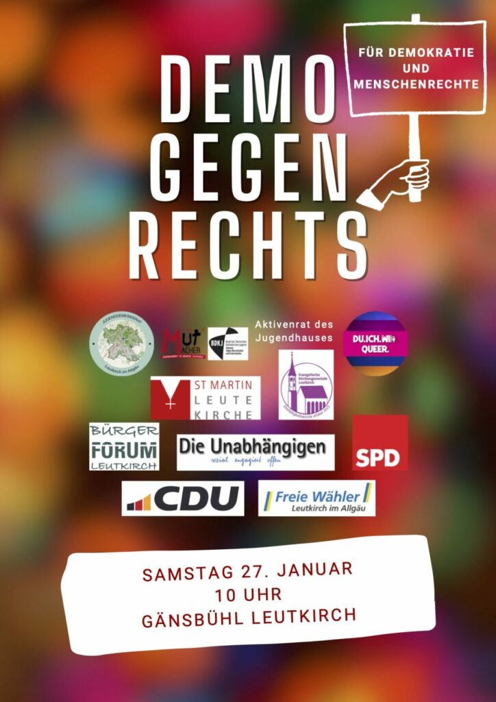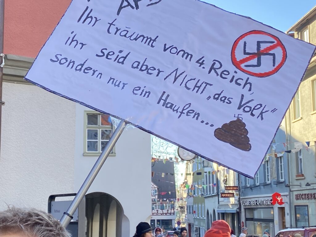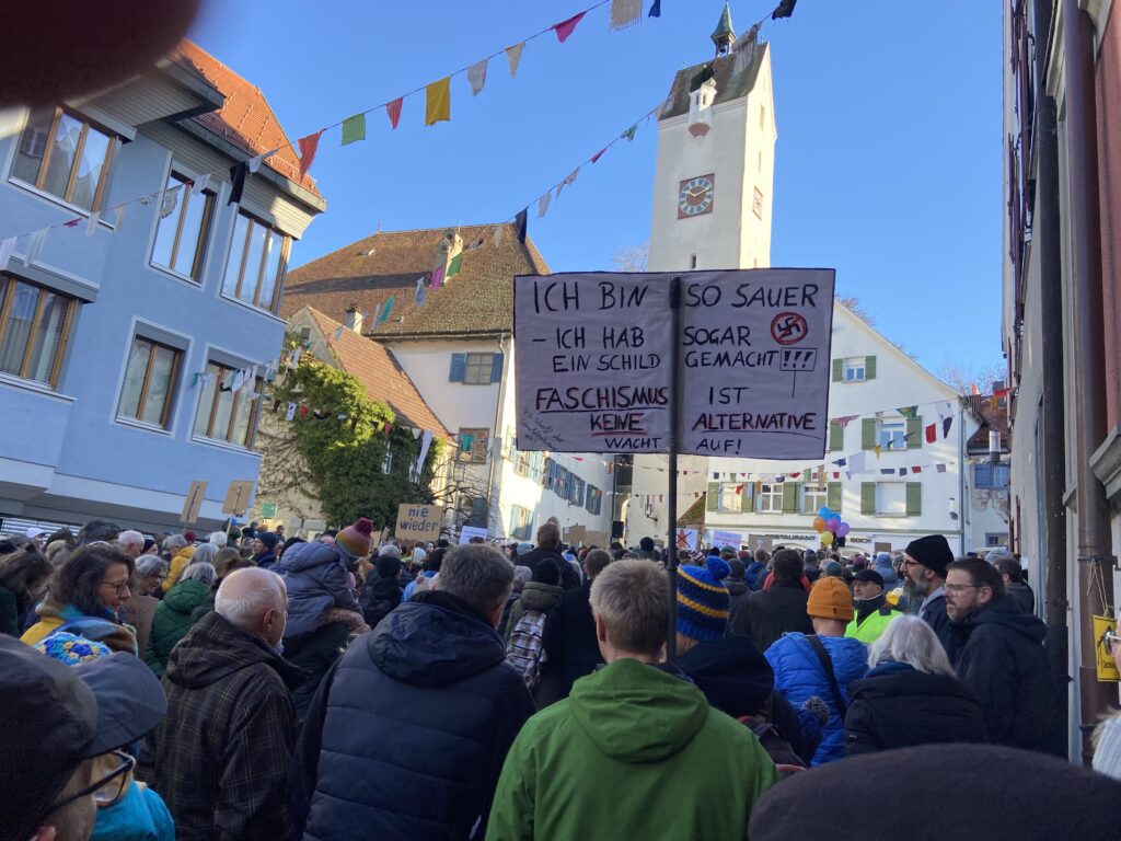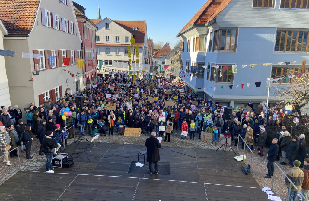 Leutkirch – Samstag, 27. Januar, Gänsbühl: Demo gegen Rechts. Eine Veranstaltung, die einer der Redner, Oberbürgermeister Hans-Jörg Henle, ein „Zeichen für Demokratie und Menschlichkeit“ nannte. Zwischen der Freiluft-Plattform des Cafés „Bock“ und einschließlich der Marktstraße drängten sich Hunderte Teilnehmerinnen und Teilnehmer. Eine genauere Zahl will das Polizeirevier Leutkirch auf Anfrage der „Bildschirmzeitung „Der Leutkircher“ am Montag nennen. Mehrmals mahnten Sprecherinnen und Sprecher am Veranstaltungs-Mikrophon den Artikel 1 des Grundgesetzes an: „Die Würde des Menschen ist unantastbar.“ Schriftsteller Imre Török bezeichnete die AfD als „Antidemokraten für Destruktivität“. Jugendgemeinderätin Melissa Altergott forderte „Brücken der Verständigung“. Unser Reporter Julian Aicher berichtet.