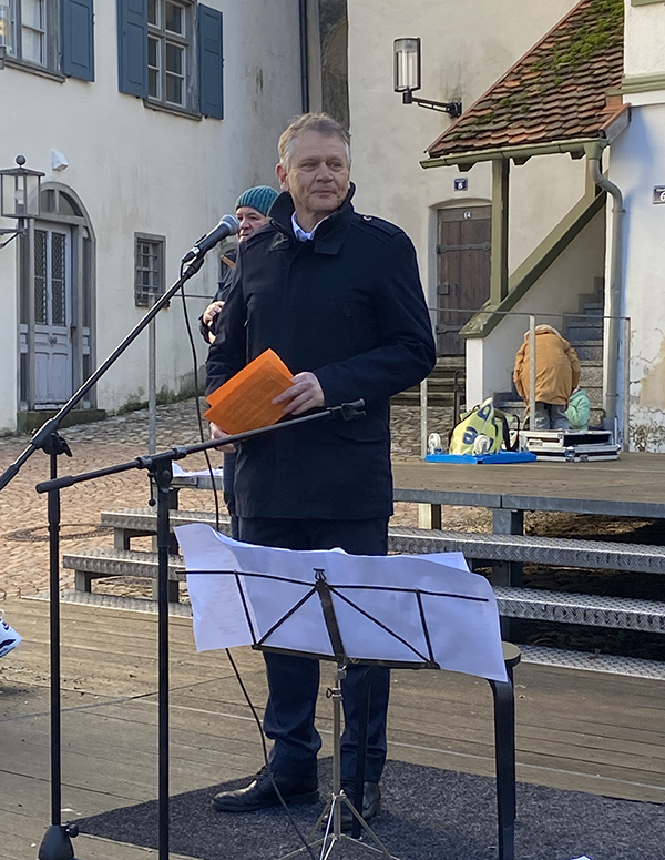 Oberbürgermeister Hans-Jörg-Henle spricht am 27. Januar auf dem Gänsbühl bei der „Demo gegen Rechts“.