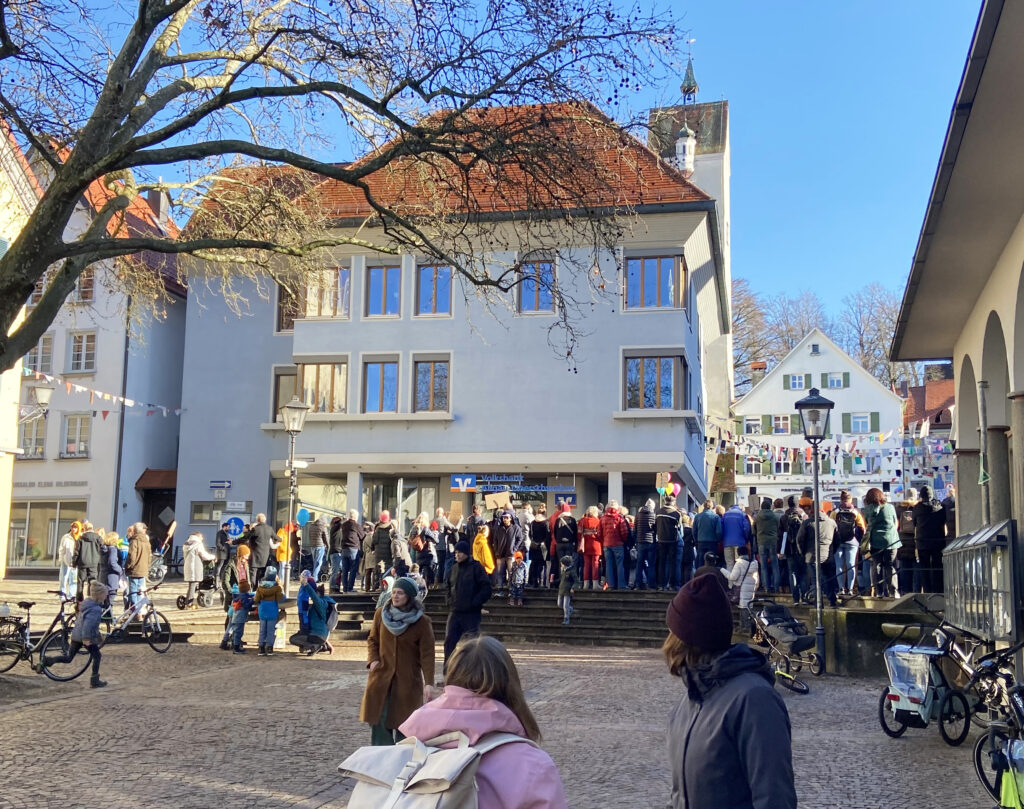 Bei der Kundgebung unter Fasnets-Fähnchen über dem Gänsbühl zeigten sich vereinzelt auch einige Hästräger. Einer der Veranstalter – Leutkircher Jugendorganisationen, Kirchengemeinden und die Gemeinderatsfraktionen – lobte, dass die Narrenzunft „Nibelgau“ sich „solidarisch mit unserer Veranstaltung“ erklärt habe.