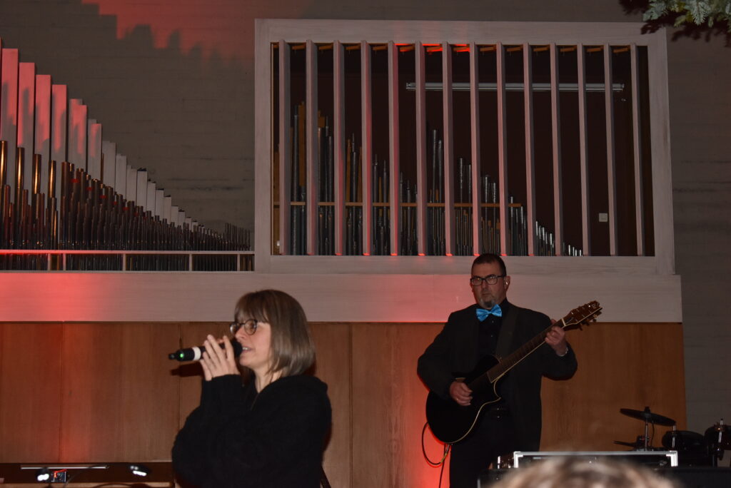Es begann weihnachtlich mit einer Instrumental-Darbietung der Band inklusive Oboe, mit 35 kräftigen oder zarten Stimmen des Gospelchors Aitrach und noch mehr Stimmung im Saal. Wer träumt nicht Jahr für Jahr von weißen Weihnachten, ein sehnsüchtiger Wunsch vieler, der im weltbekannten englischen Stück aus dem Jahr 1942 „Dreaming of a white christmas“ musikalisch verarbeitet wurde. Solistisch wunderschön dargebracht von der Dirigentin und Solistin Tanja Scheuch, zusammen mit Klaus Bodenmüller.