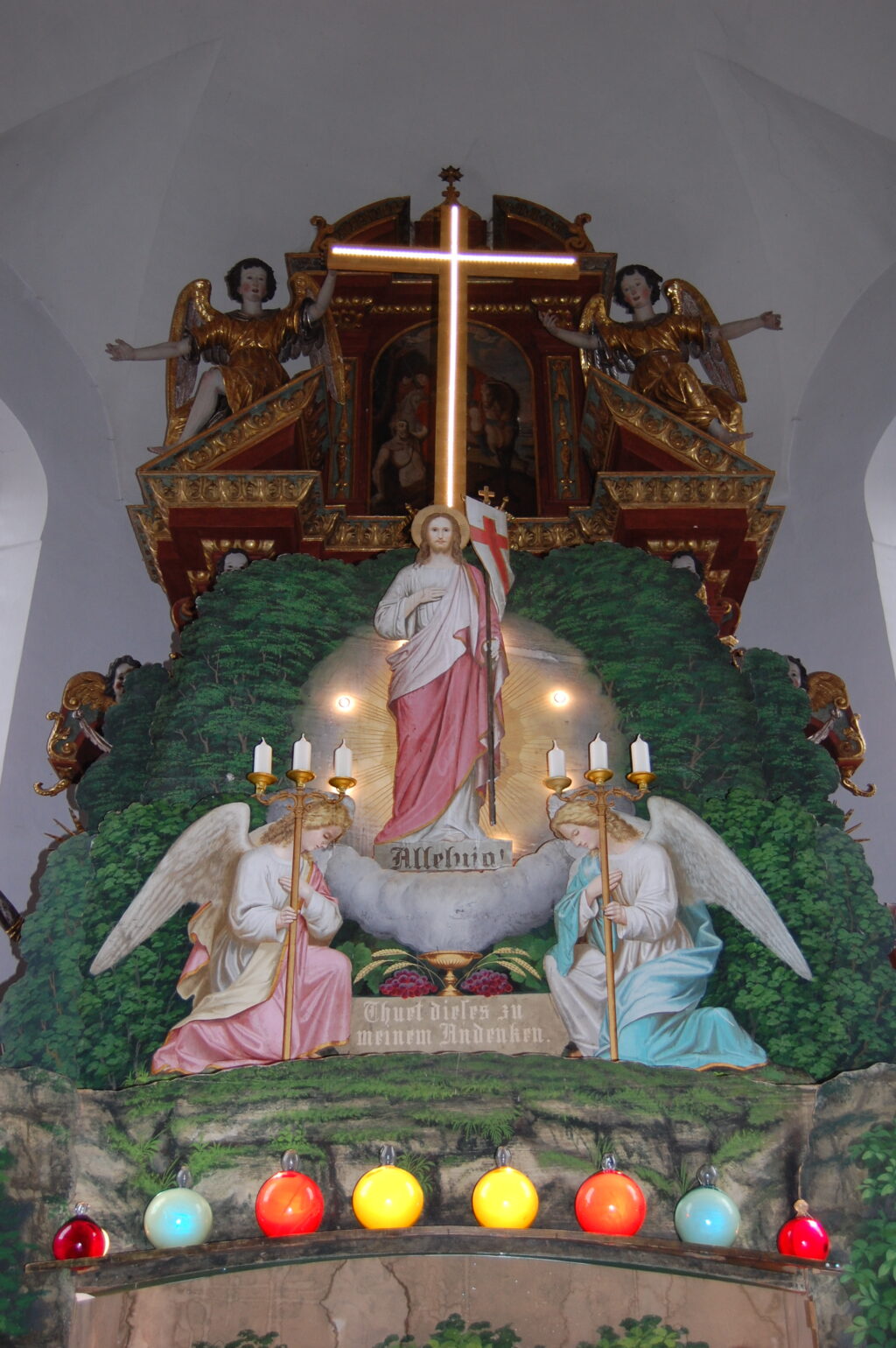 Das sogenannte Heilige Grab beinhaltet die Grabesgrotte mit der Darstellung des Leichnams Jesu, die zum Karfreitag und Karsamstag gezeigt wird. „Zum festlichen Ostergottesdienst wird durch einen Mechanismus der Leichnam Jesu verschwinden und es erscheint langsam eine auferstandene Christusfigur und ein erleuchtetes Kreuz, wodurch die Auferstehung sehr anschaulich gemacht wird. Besonders zu erwähnen sind auch die in verschiedenen Farben leuchtenden Glaskugeln, die den bemalten Holzaufbau schmücken und an die Zeit der Glasmacher im Kreuzthal erinnern“, erklärt Uschi Kolb. Die Osternachtfeier mit Osterfeuer vor der Kirche ist am heutigen Karsamstag (30. März) um 21.00 Uhr.