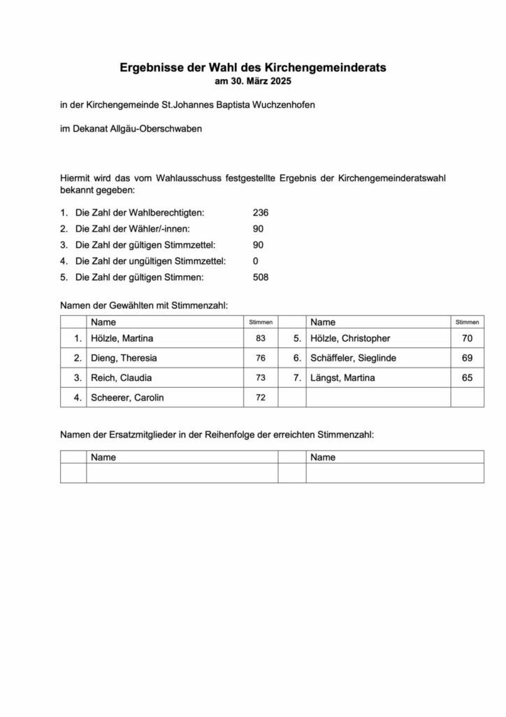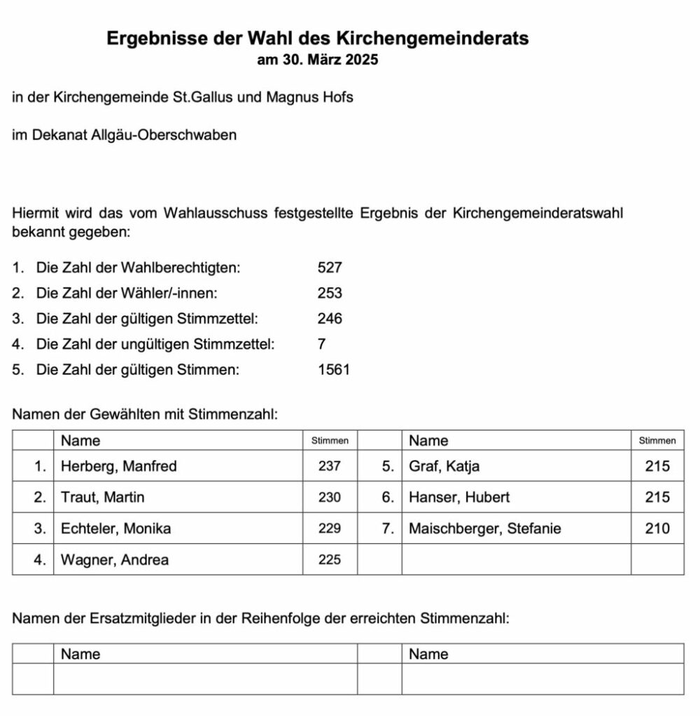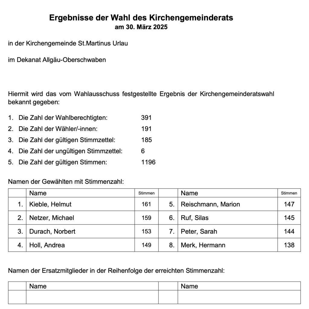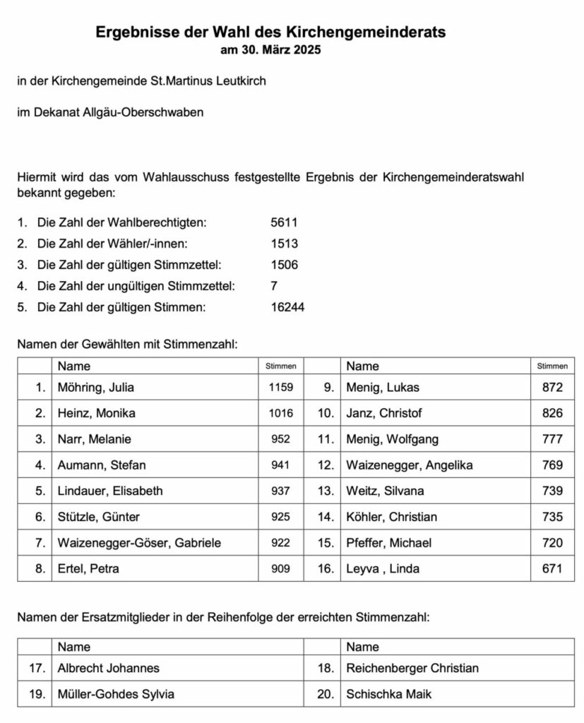 Leutkirch (rei) – In den sieben katholischen Kirchengemeinden der Seelsorgeeinheit Leutkirch (SE) waren bei den Kirchengemeinderatswahlen am 30. März 7493 Katholiken über 16 Jahre wahlberechtigt. Von diesen gingen 2389 zur Wahl. Das ergibt eine Wahlbeteiligung in der gesamten SE von 31,9 Prozent (zum Vergleich: In der gesamten Diözese Rottenburg-Stuttgart gingen 22,6 Prozent der Katholiken zur KGR-Wahl; im Dekanat Allgäu-Oberschwaben waren es 30,1 Prozent). Die höchste Wahlbeteiligung in der SE Leutkirch hatte die kleinste der sieben Pfarreien: Ottmannshofen. Dort gingen 60,7 Prozent der 117 Wahlberechtigten zur Wahl. Das Pfarrsekretariat in Leutkirch hat uns nachstehende Ergebnisse übermittelt: